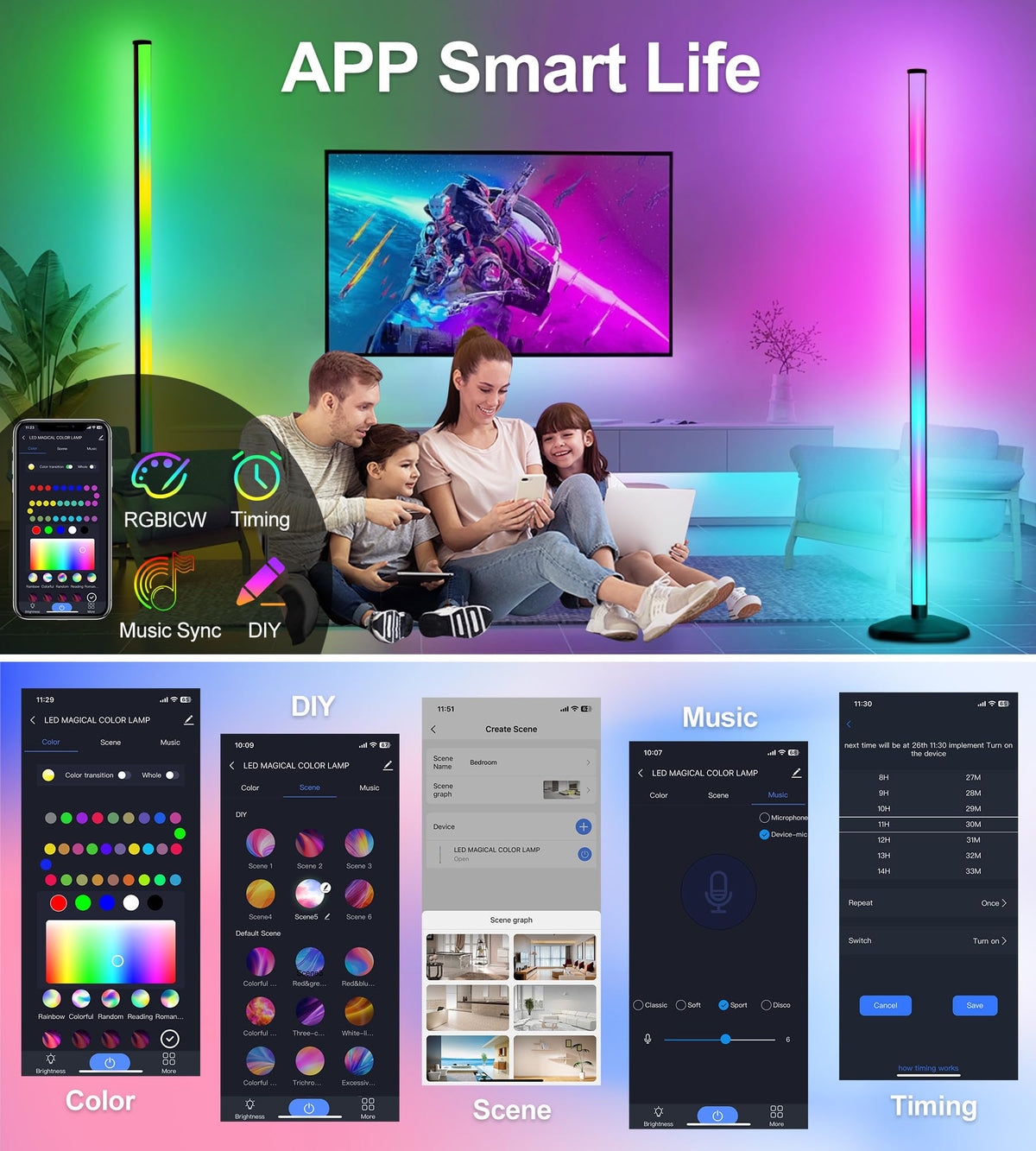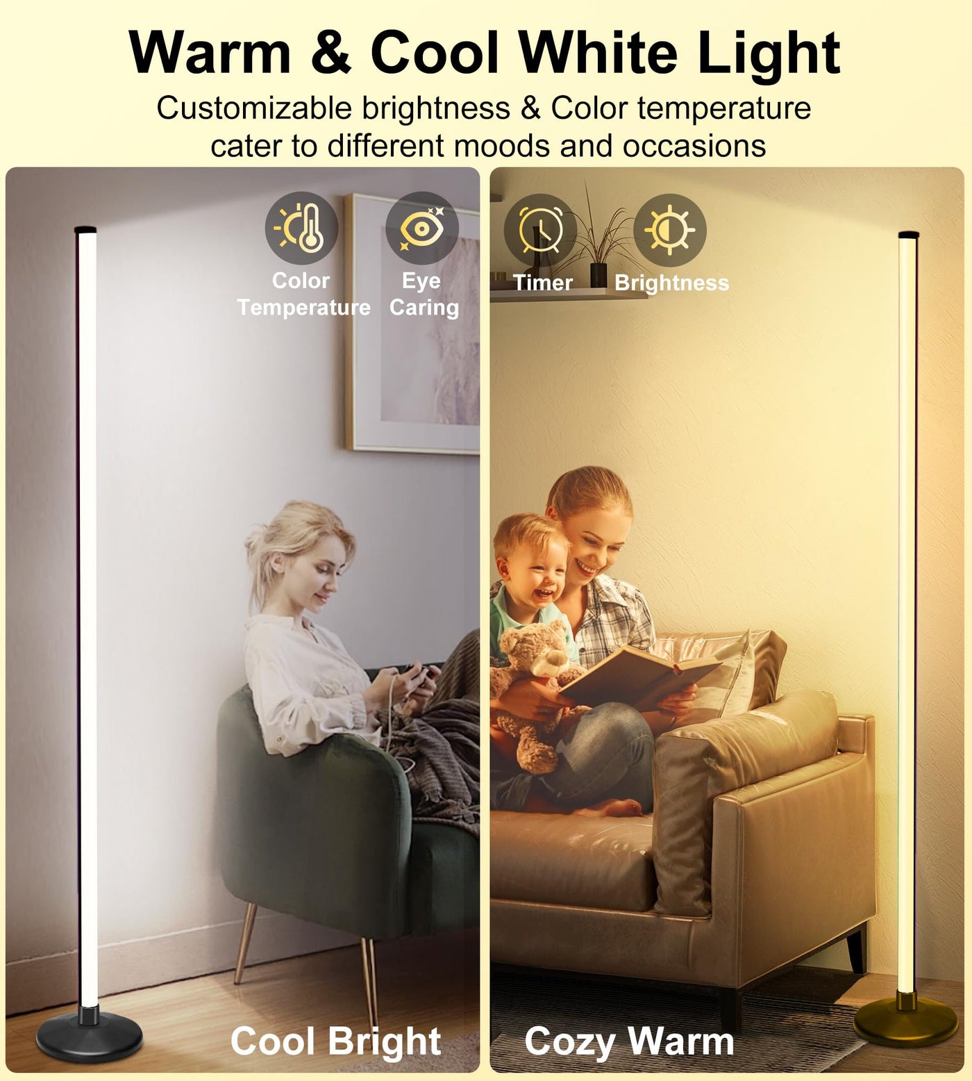 Q: Can the corner lamp be used for different types of lighting?A: Yes, the corner lamp can be used for various lighting needs, including bright cool white light for reading, cozy warm light for relaxation, and dynamic RGB colors for parties. Its customizable brightness and color settings make it suitable for any environment.
