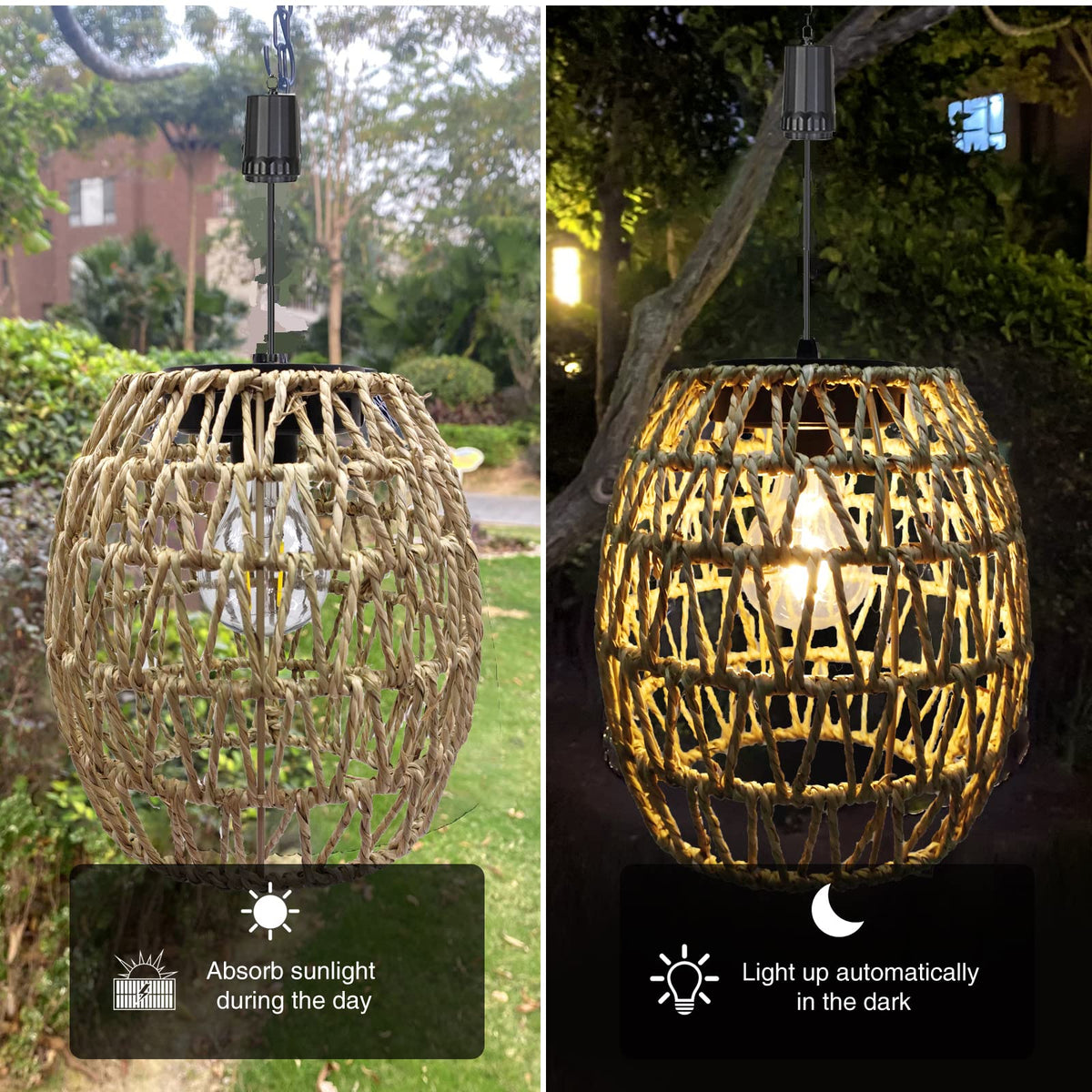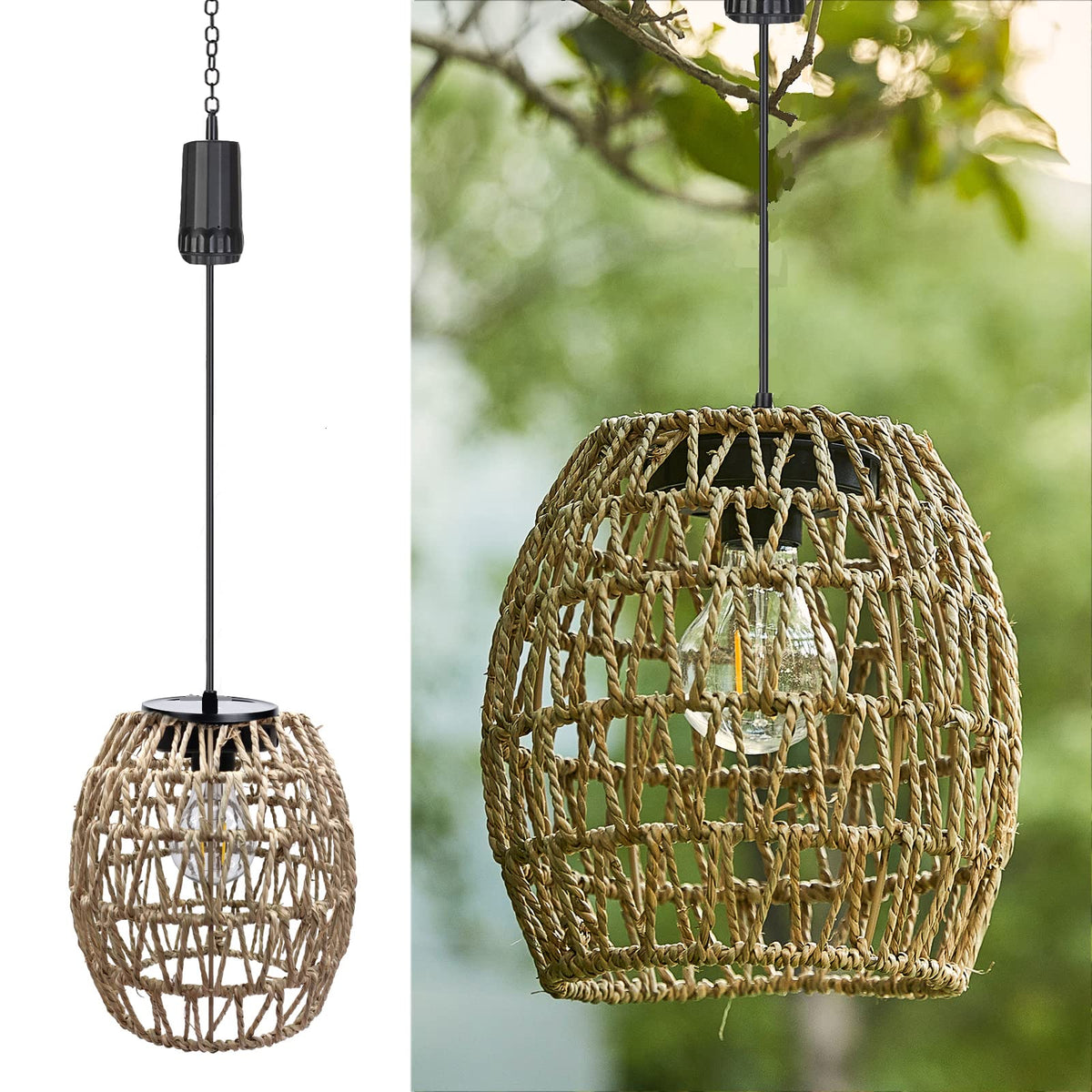 Larekook 6-Hour Timer Waterproof Outdoor Hanging Light, Seagrass Pendant Lantern, Warm White