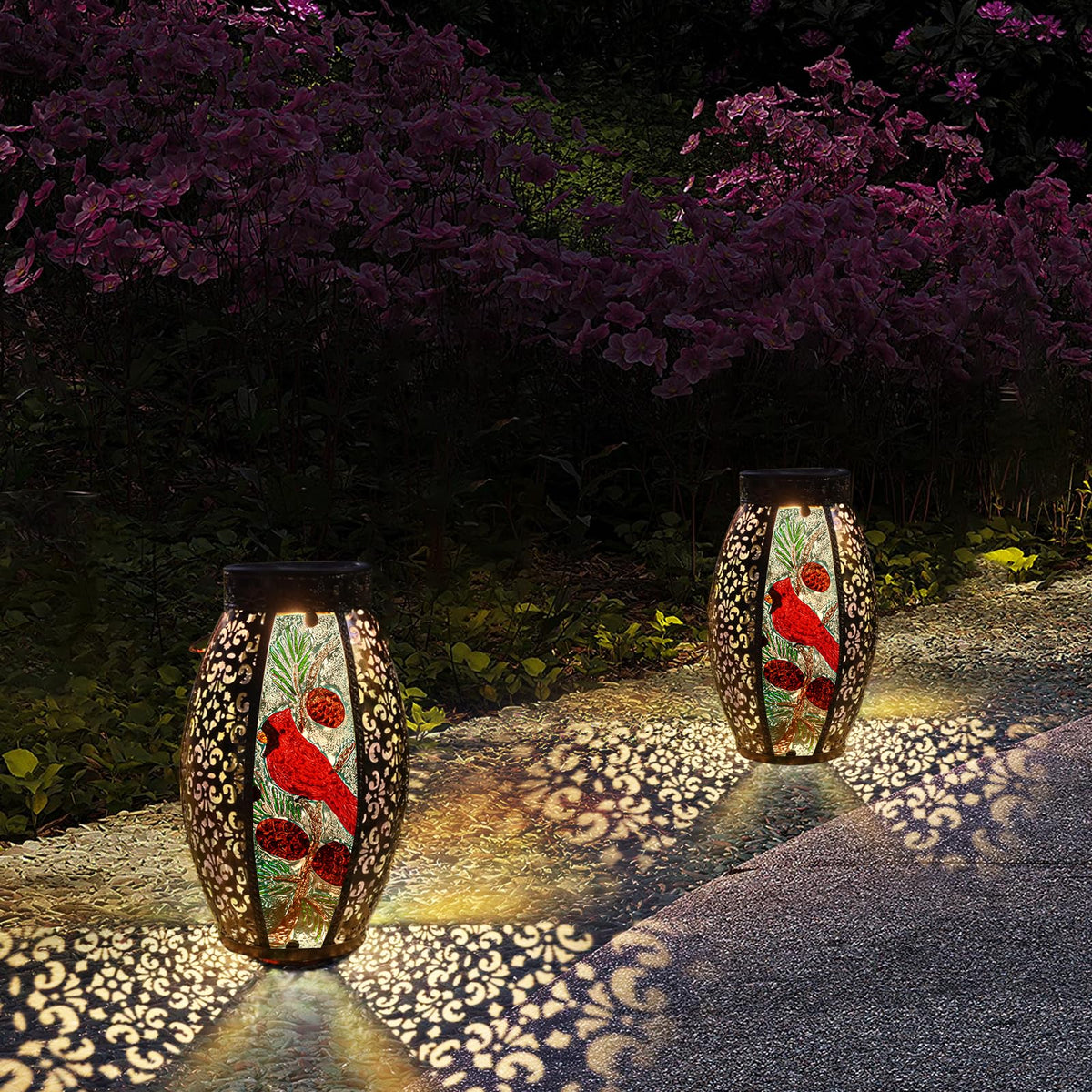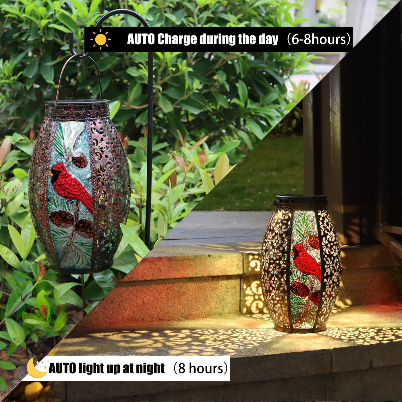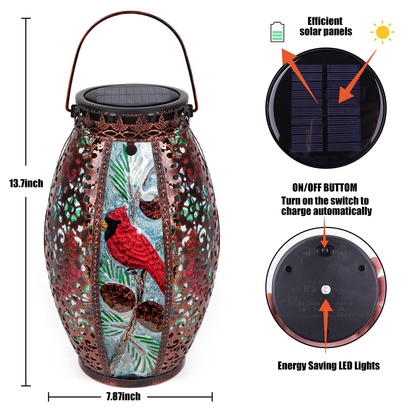 - **Unique Glass Design:** The exquisite cardinal pattern and vintage appearance of this hanging solar lantern create a warm and inviting charm for your outdoor decor. Enhance your garden or tabletop with this eye-catching piece that showcases both beauty and elegance.