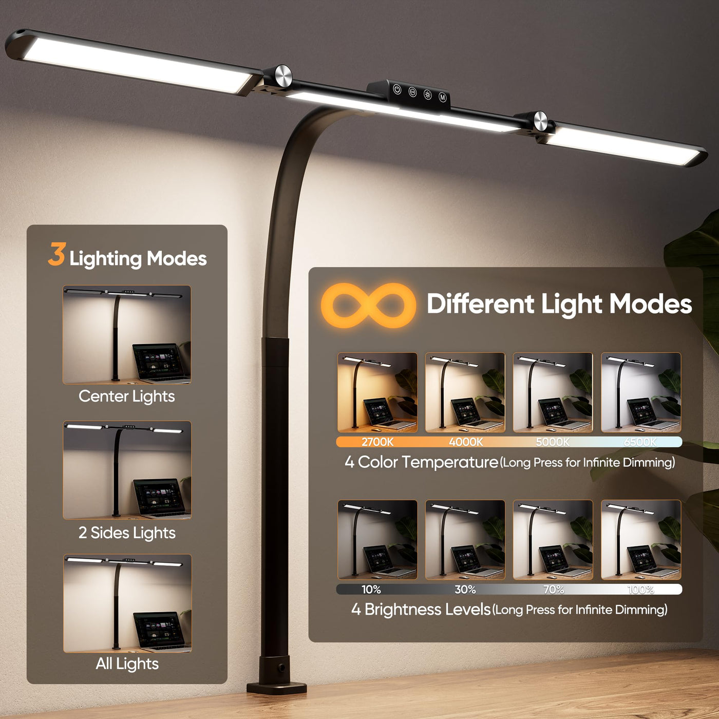 Q: How does the stepless dimming feature work?A: The desk lamp offers stepless dimming that allows you to adjust brightness from 10% to 100% and color temperature from 2700K to 6500K, ensuring you can create your preferred lighting ambiance for any task.