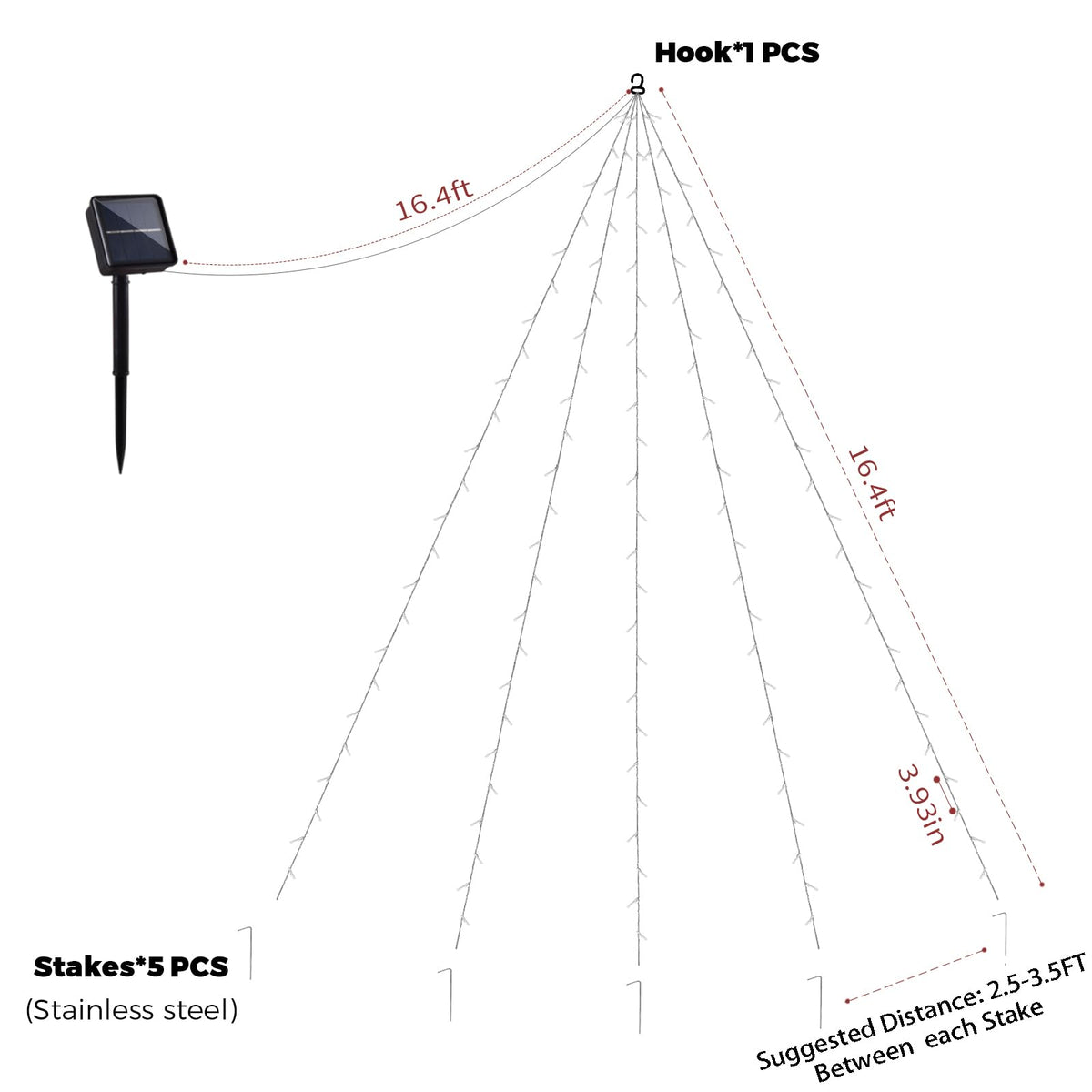 Q: How long are the Large Size Solar String Lights?A: The Large Size Solar String Lights measure 16.5FT and consist of 5 pieces, providing a substantial length ideal for outdoor setups.