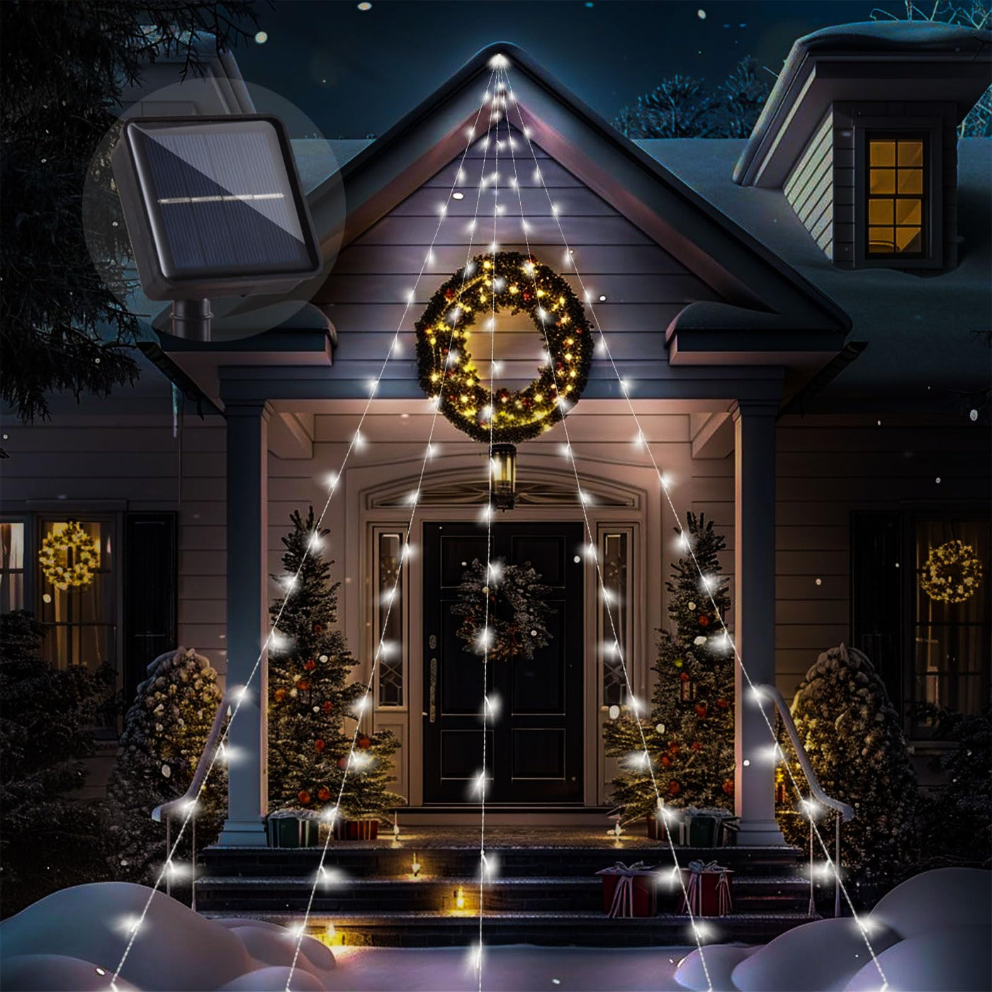 Q: How do the solar string lights work?A: The solar string lights are solar-powered with a built-in panel that automatically charges during the day and turns on at night, ensuring energy-efficient operation without needing a power outlet.