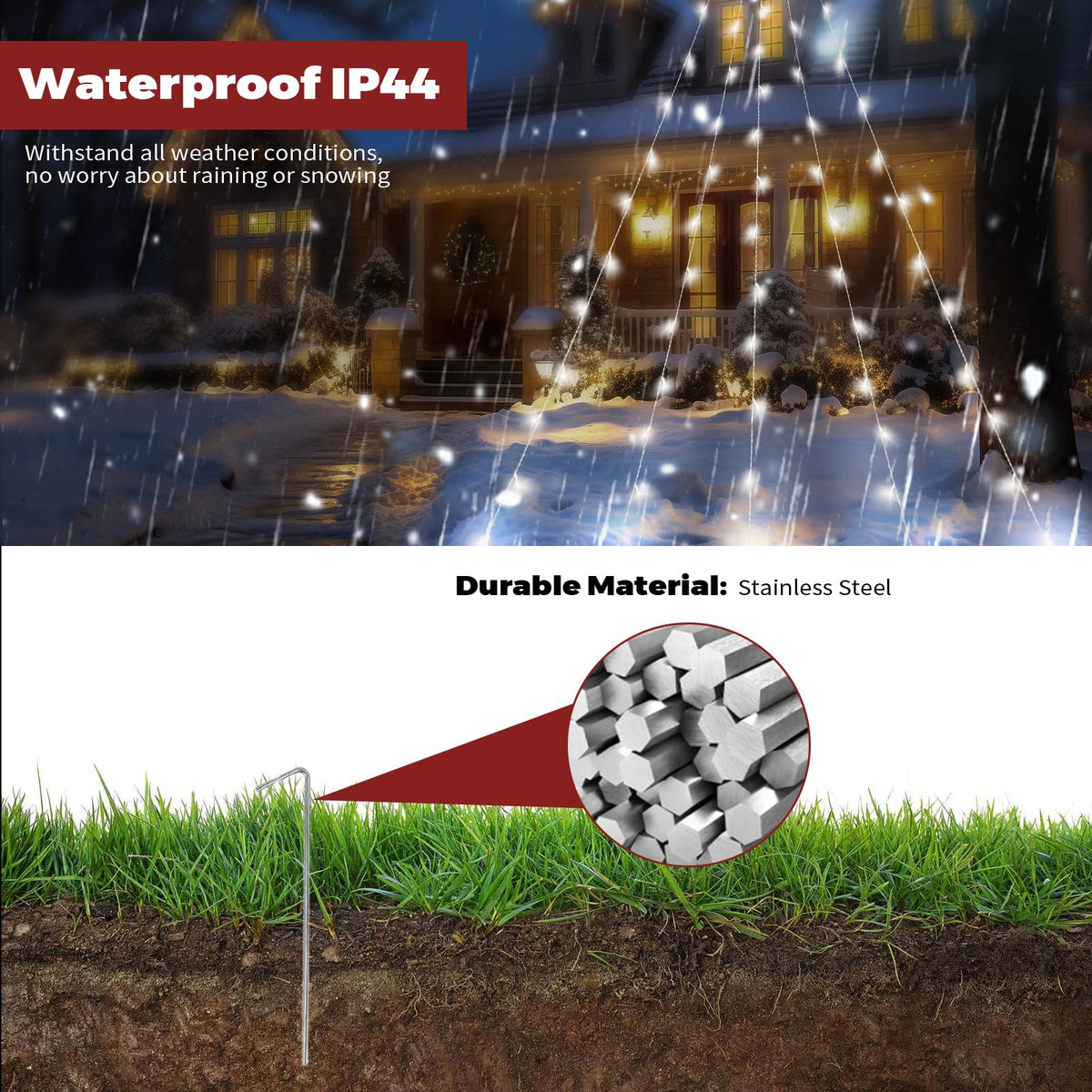 Q: Are the solar string lights weatherproof?A: Yes, the lights are IP44 waterproof rated, meaning they can withstand various weather conditions, including rain and snow, making them suitable for outdoor use.
