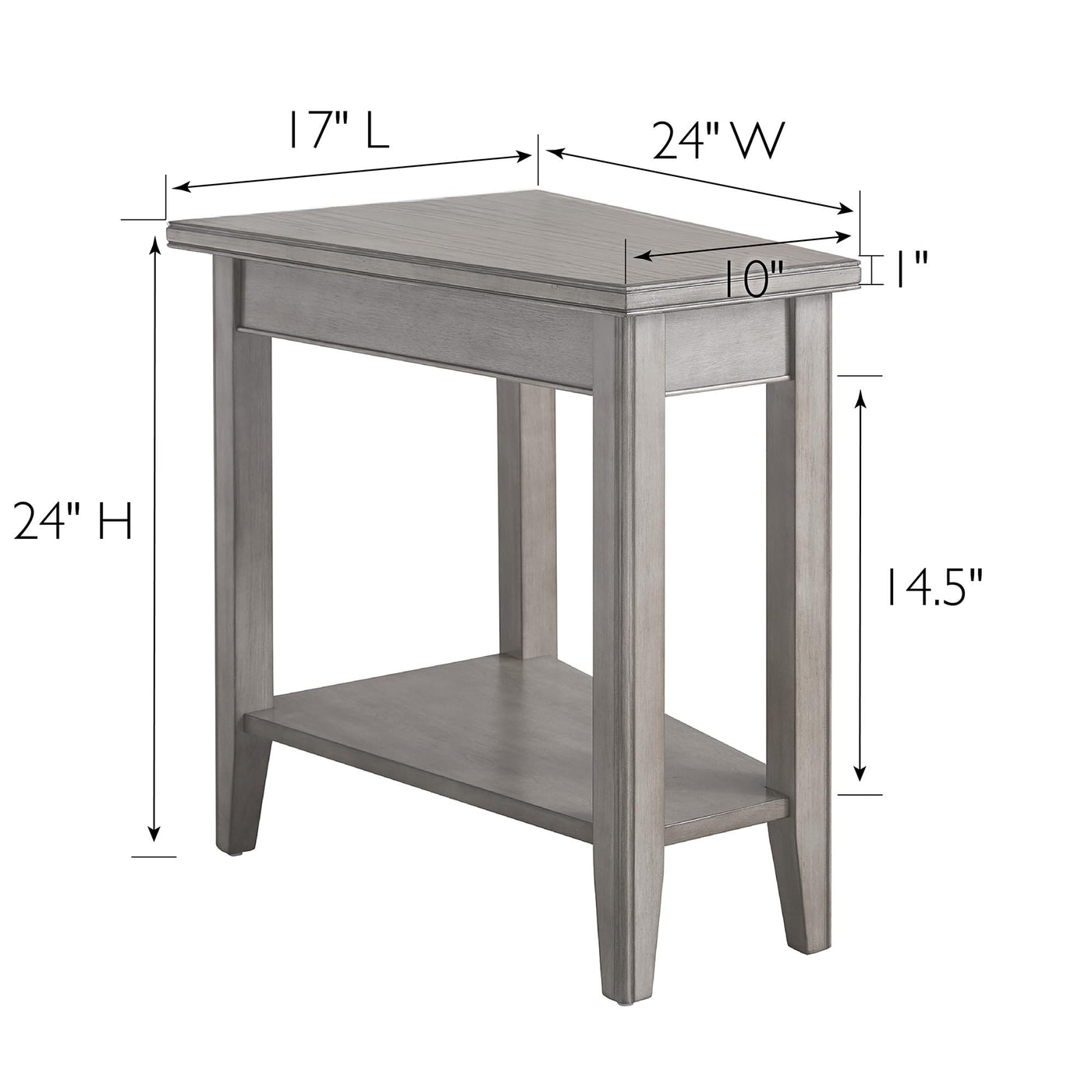 The Laurent Recliner Wedge End Side Table by Leick Home offers a stylish and space-saving solution for living rooms, bedrooms, and cozy seating areas. Designed with a wedge-shaped silhouette, this compact table fits perfectly between recliners, sofas, or into tight corners, making it ideal for small apartments, condos, or transitional spaces. This solid wood table showcases natural grain variations with a rich Smoke Gray finish, offering a timeless look that complements both modern and traditional interiors. The heavily scaled top and posts, softened with beaded edge details, add character and durability, ensuring long-lasting beauty and function. A lower display shelf provides additional space to organize books, decorative accents, or essentials while keeping your living area tidy. Measuring 17 inches long, 24 inches wide, and 24 inches high, this end table provides the perfect balance of compact design and practicality. Designed for quick and effortless assembly, it includes all necessary tools, making setup a breeze. With a weight capacity of 50 lbs., it offers sturdy support for lamps, drinks, and decorative items. Backed by Leick Homes 150+ years of craftsmanship and a 1-year limited warranty, this table ensures reliability and style for years to come.