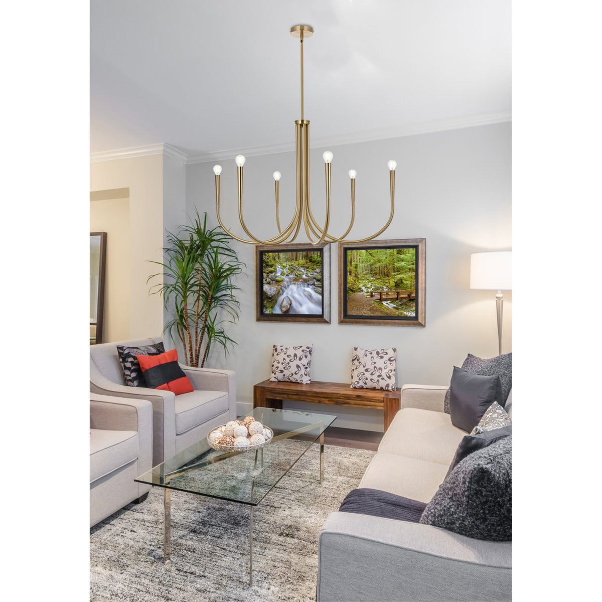 Equipped with six arms this chandelier provides generous illumination to brighten up any space. Each conical end ensures a focused and balanced distribution of light creating a warm and inviting atmosphere. The smooth and curved design of the tubular arms creates a gentle inviting glow that bathes your room in a soft diffused light. Enjoy a welcoming ambiance that beckons you to unwind and relax. The arms of this chandelier ingeniously stack vertically forming a stunning display of tubes that adds depth and dimension to the overall design. This unique arrangement sets it apart from traditional chandeliers making it a true conversation starter. Sloped ceiling adaptable with a durable swivel could be mounted on vaulted or angled ceilings.