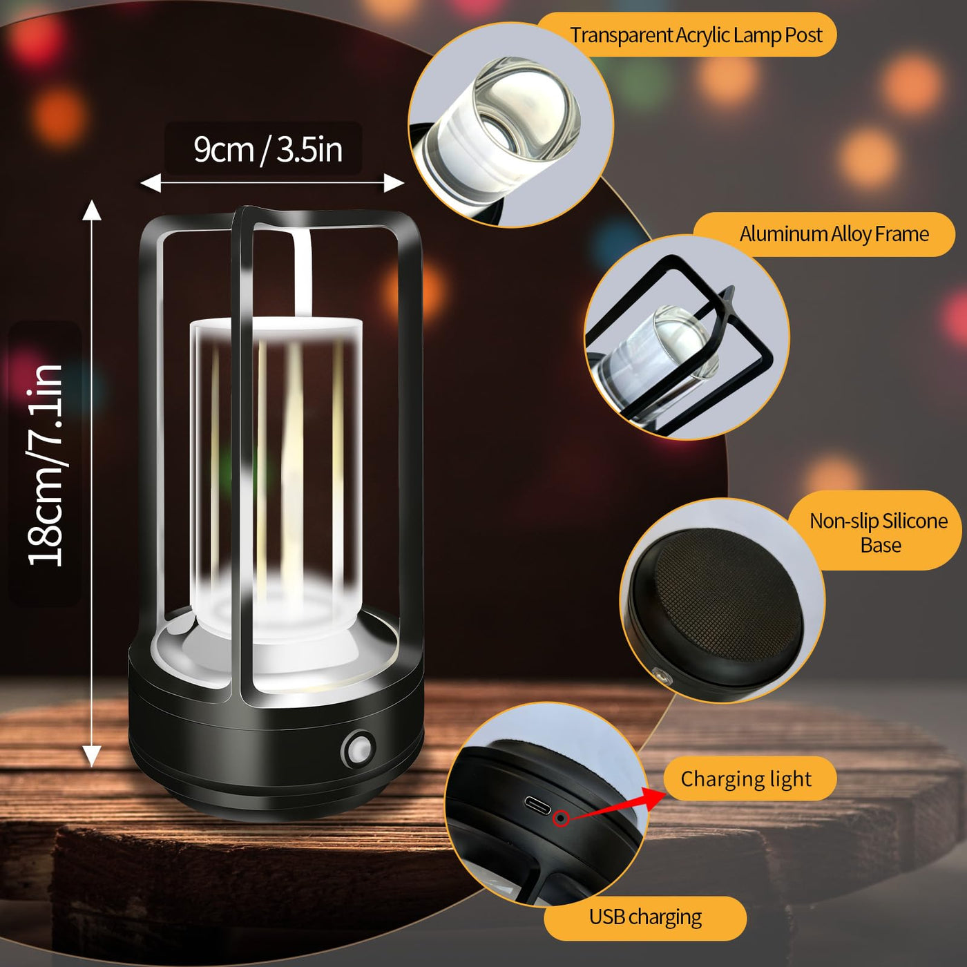 This portable outdoor table lamp is a versatile lighting solution for both indoor and outdoor settings. With its rechargeable cordless design and LED technology, you can enjoy warm, ambient lighting anywhere without the hassle of cords or outlets. The lamp features three color modes and infinite dimming, allowing you to create the perfect ambiance for any occasion. Whether youre dining at a restaurant, relaxing in your bedroom, enjoying drinks at a bar, studying at a reading room, or camping under the stars, this portable metal table lamps provides a reliable and energy-efficient source of illumination. Crafted from durable metal with a black coating finish, it combines style and functionality. Easily charge the lamps battery for convenient, cord-free use. Approximate dimensions: 7.1 inches tall, 3.5 inches wide