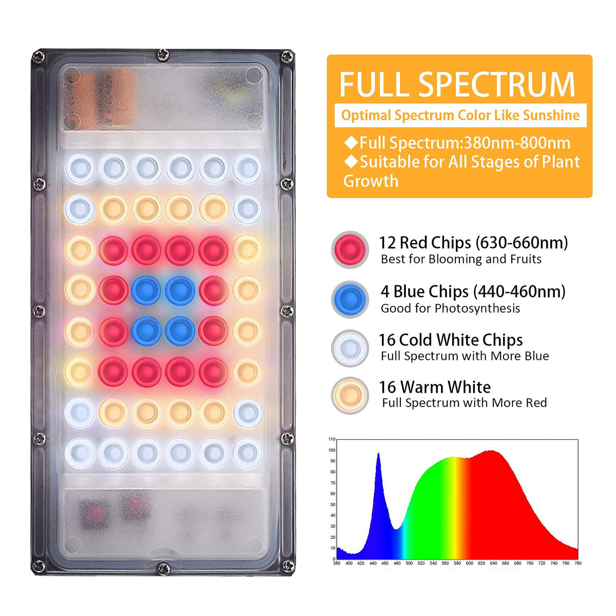 The healthiest plants are grown under light. Without sunlight, photosynthesis wouldn’t take place and a plant’s growth would be stunted. In fact, plants wilt before dying when they’re not exposed to sunlight. When you need to grow plants indoor, you need to provide plant grow lights.LBW LED grow light is designed to improve your indoor grow. Apply to:Indoor garden,grow tent,grow room,greenhouse,aquarium for hydroponics,plant grow,seed breeding,flower blooming during cold winter and spring or less sunshine day.Ideal for all kinds of indoor plants: orchids, roses, peppers, tomatoes, basil, lettuce, herbs, kale, spinach, wheatgerm, broccoli, wildflowers,cucumbers, and many other fruits and vegetables. Parameters:Product Size: 16.7 * 5.11 * 5.31 inches Product Weight: 2.5 lbs Material: Al alloy Wavelength: Full Spectrum (White Red Blue) LED Chip Quantity: 48pcs (12 red/4 blue/16 warm white/16 cold white) Input Voltage: AC100V-130V Rated Power: 30W±5% Frequency: 60 Hz Plug: US standard 2-pin-plug Rated Lifetime: 50,000 Hours