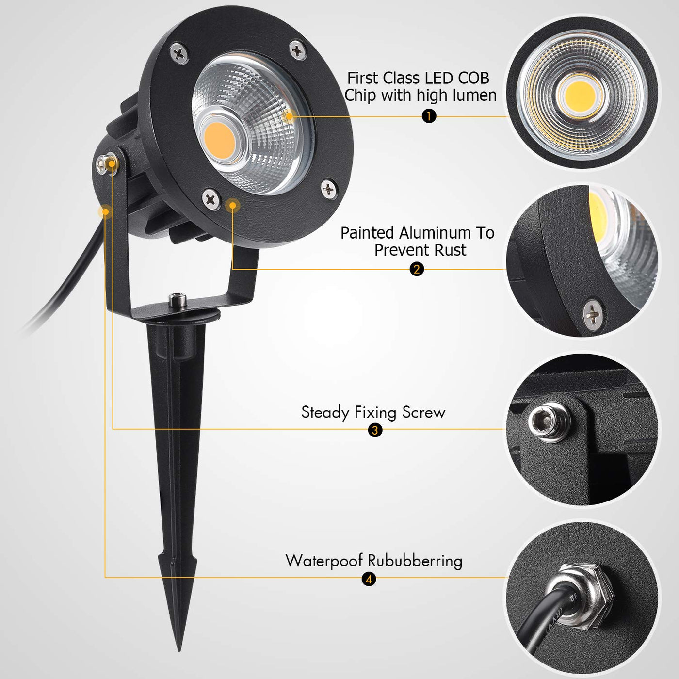 - **Robust Metal Construction**: Unlike competitors using plastic, this spotlight features a cast aluminum design, ensuring enhanced durability and stability. The metal ground stake keeps the spotlight securely in place while resisting wear and tear.