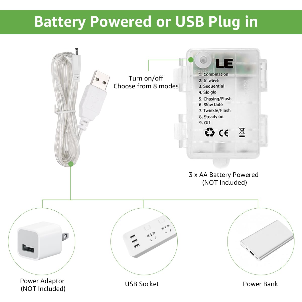 Q: How do I power the LE Fairy Curtain Lights?A: These curtain lights can be powered either by 3 AA batteries (not included) or through a USB connection, allowing for flexible placement without the need for nearby outlets.