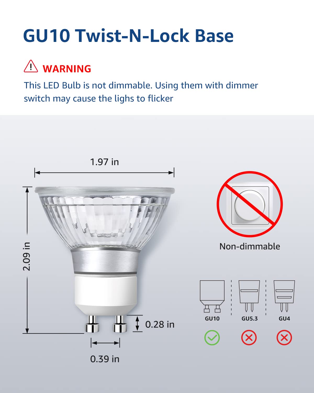 Q: Are these LED bulbs dimmable?A: No, the LE GU10 LED light bulbs are non-dimmable. Using them with dimmer switches may cause flickering, so it's recommended to use them with standard on/off switches.