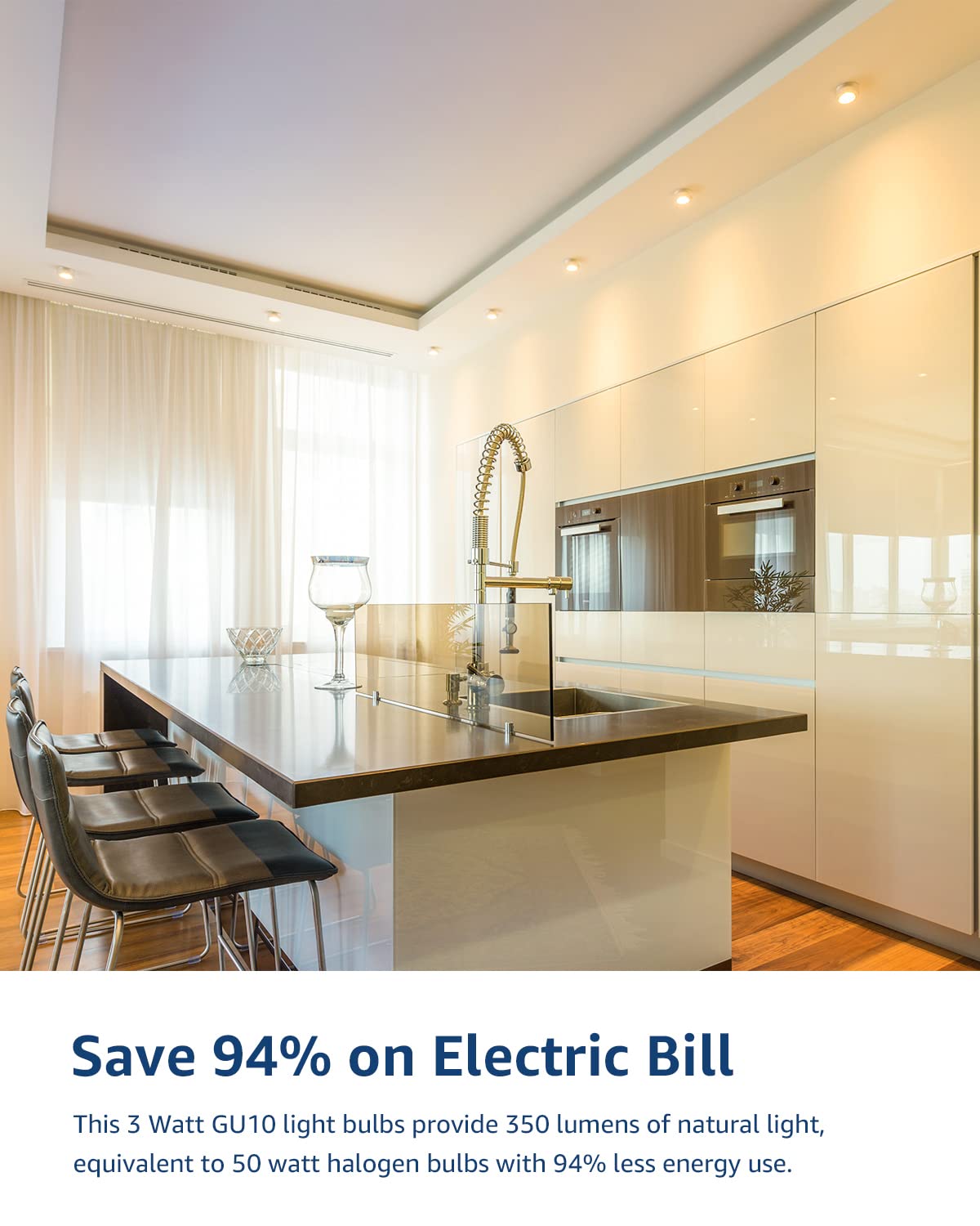 - **Energy Efficient & Long Lasting**: Achieve significant savings on your electricity bill as these 4W GU10 LED bulbs replace 50W halogen bulbs, reducing energy consumption by up to 92%. With a lifespan exceeding 15,000 hours, they last ten times longer than traditional halogen and incandescent bulbs.
