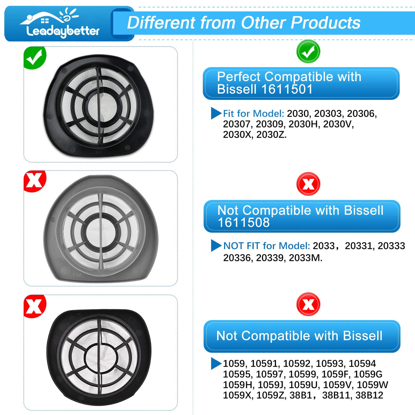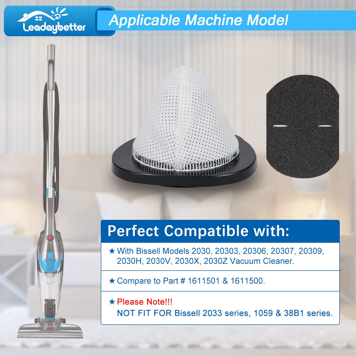 - Compatible Models: Our Leadaybetter 2030 Replacement Filters are designed specifically for Bissell 3-in-1 Lightweight Stick Vacuum models, including 2030, 20303, 20306, 20307, 20309, 2030H, 2030V, 2030X, 2030Z, and 2030L. Ensure compatibility by comparing with part numbers 1611501 and 1611500.