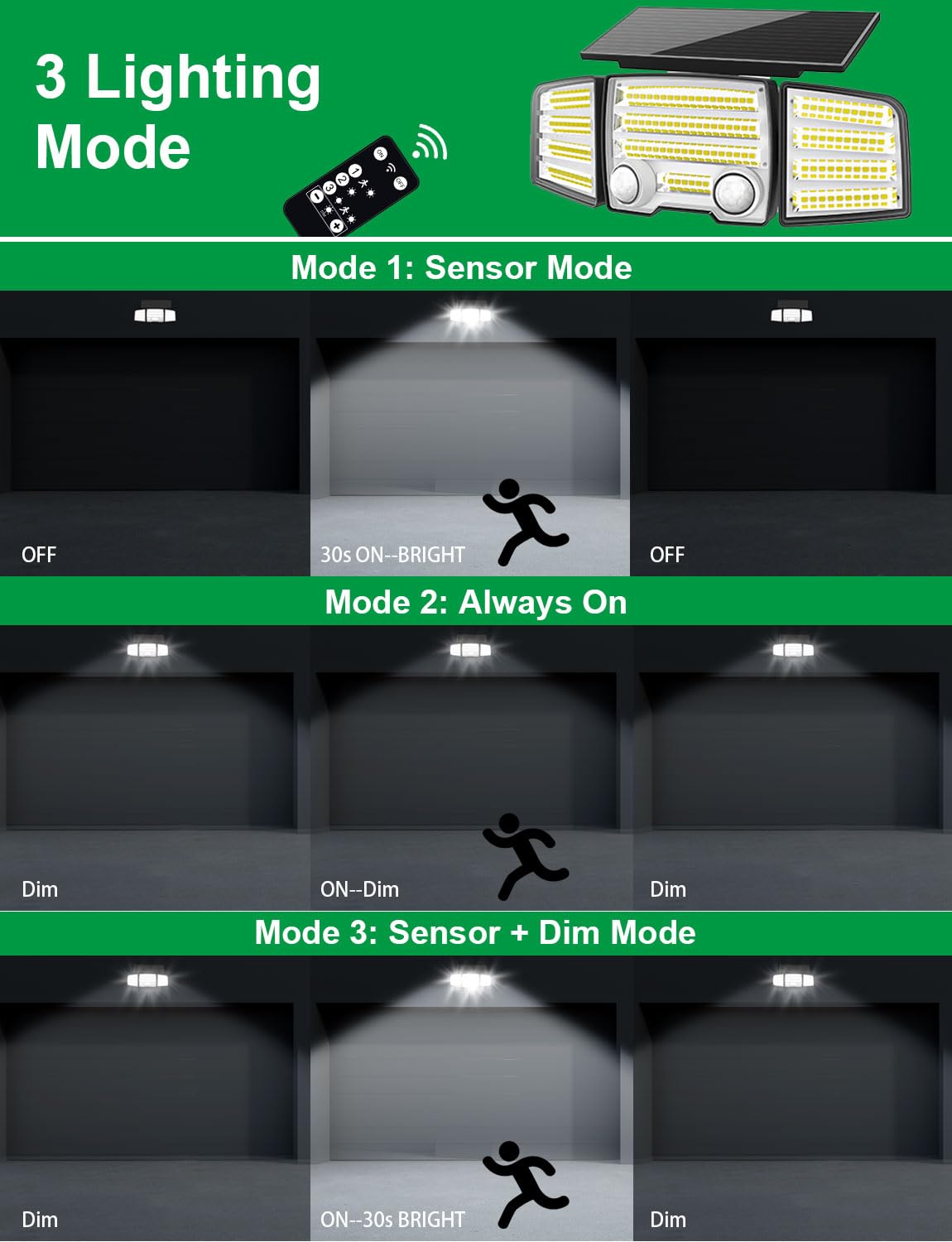 - **Three Adjustable Lighting Modes**: Easily switch between three lighting modes using the included remote control: 1) Activated strong light, 2) Dim light all night, and 3) Sensor mode for automatic activation. Customize your lighting to suit your needs.