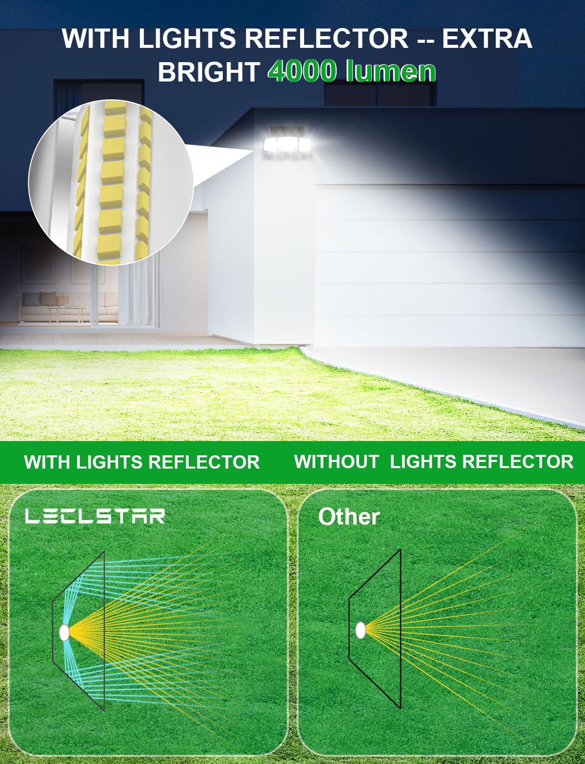 - **Powerful Illumination**: With a unique light reflector design, LECLSTAR solar lights transform 138 LED beads into 414, delivering an impressive 4000 lumens of bright, 6500K daylight. Perfect for large spaces like yards, driveways, and patios.