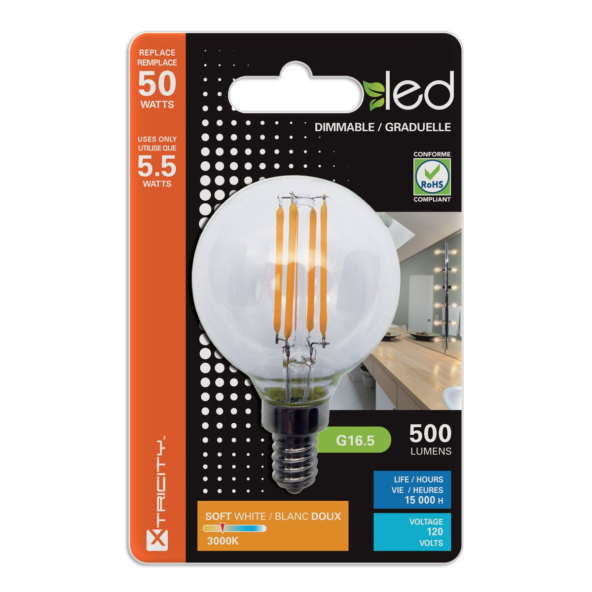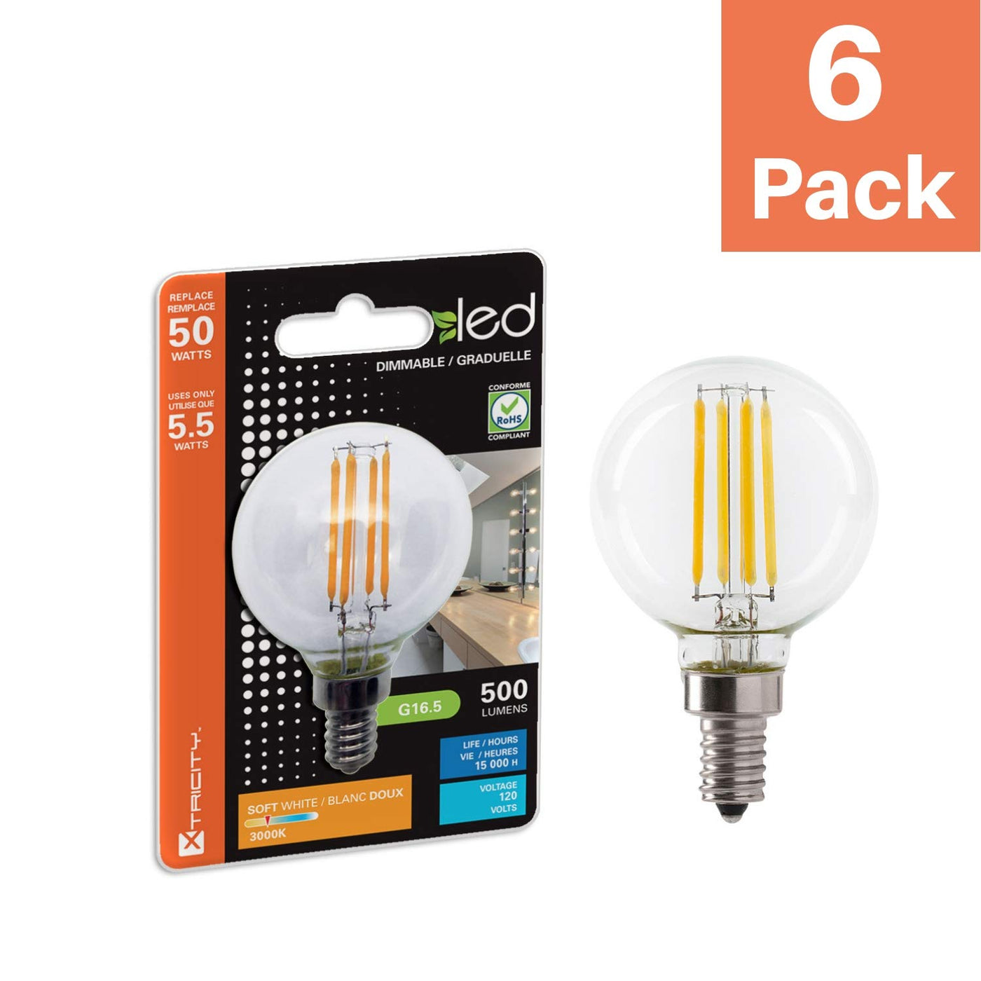 This Xtricity 50 watt equivalent G16.5 LED bulb is a great use for vanity lighting and all kinds of fixtures that use an E12 candelabra base. This light bulb is a great replacement for your 50 watt incandescent G16.5-Shape light bulb, it puts out 500 lumens by using only 5.5 watts of energy and could last up to 13.7 years on a 3 hours per day use. The bulb is designed for indoor use, has been RoHS certified and UL Listed. This Xtricity LED Soft White Globe G16.5 bulb contains no mercury and no lead for easier disposal and a better environment.