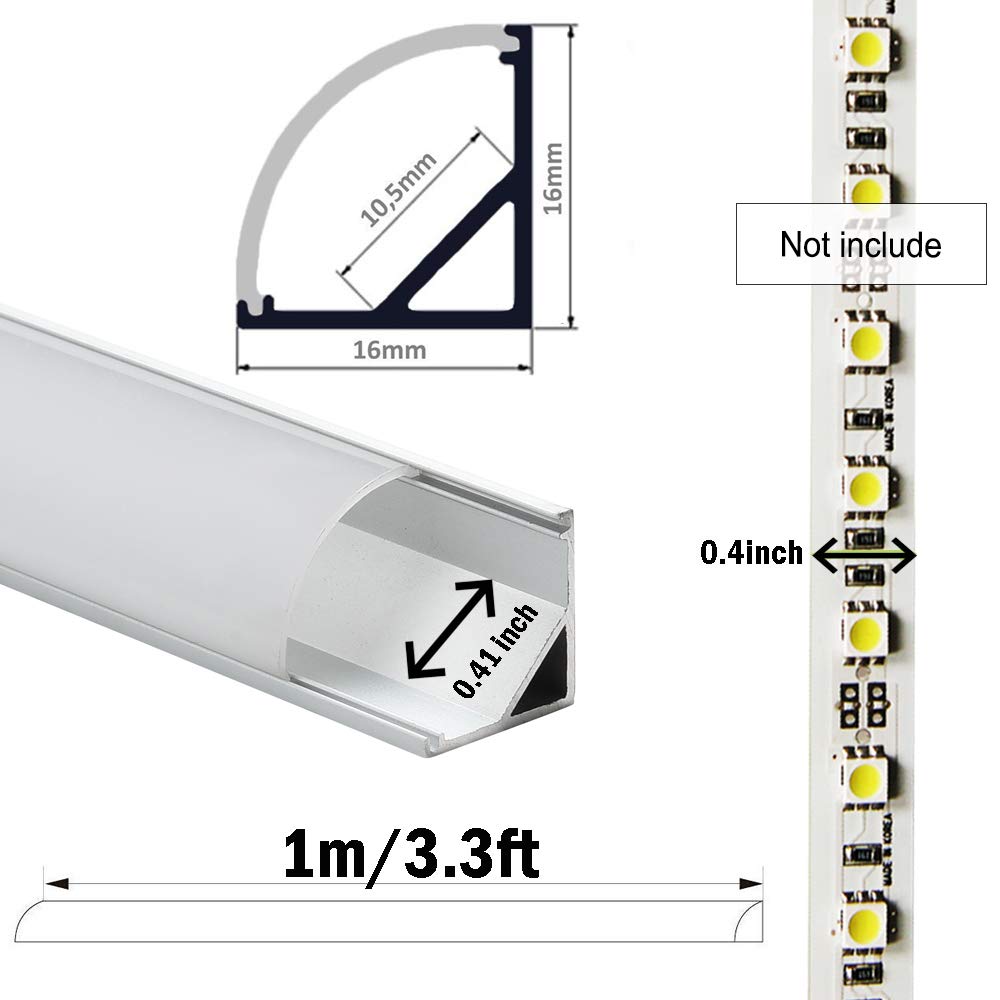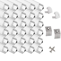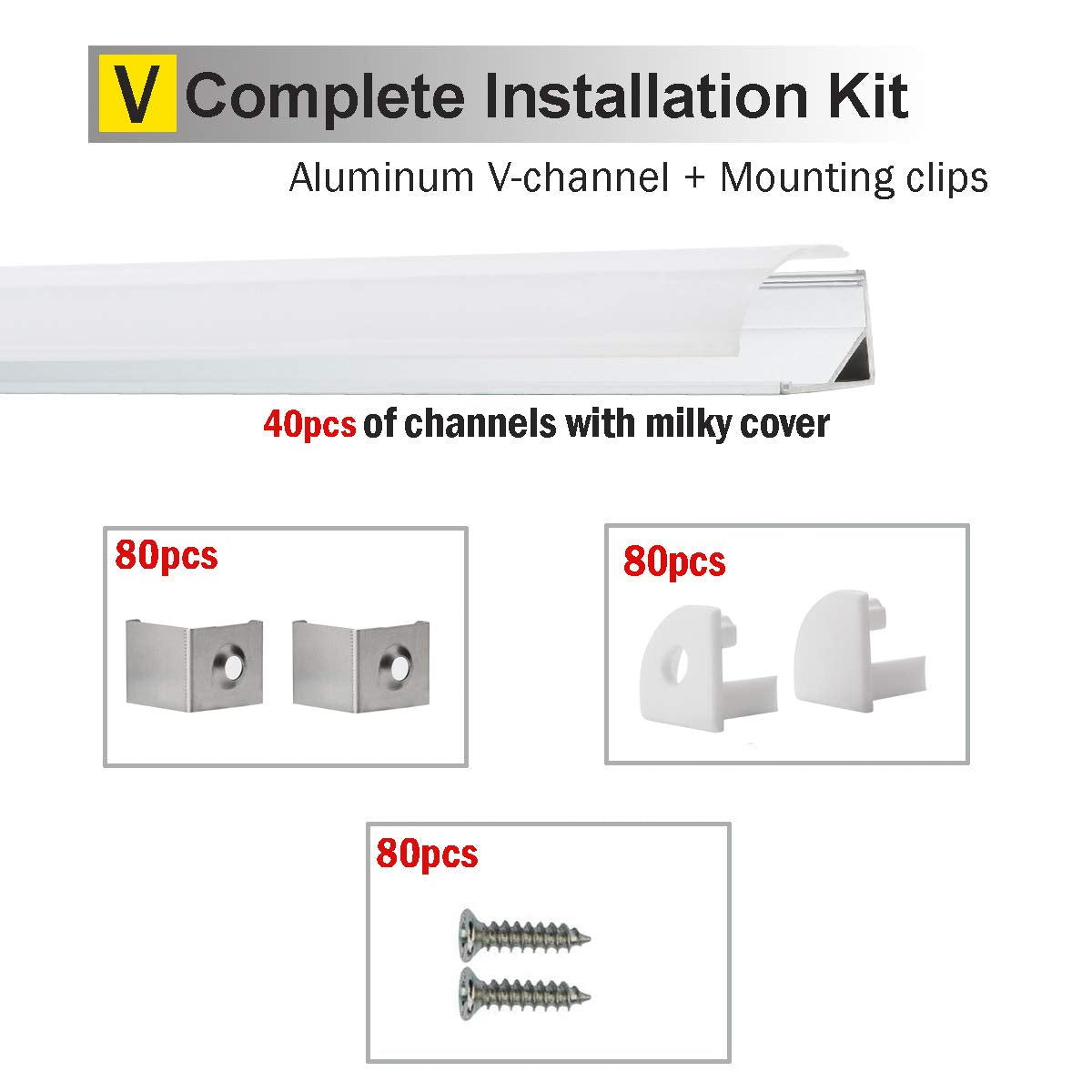 This product is an Aluminum Extrusion for your DIY lighting project .These aluminum channels are not only a great housing for LED strip lights but also act as a heat sink for them as well, which in turn will expand your LEDs lifetime as well as brightness over time.The frosted covers conceal the LED strip and make for a professional looking light fixture.This profile is compact,slim, and easy to install, perfect for under cabinet, under stairs, closets, exhibits, furniture, work stations,etc. We are Manufacture, True Quality, Well-packed, buy with confidence! Alternative Way to Hold/Fix the LED Aluminum Channel * Use Double Sided Tape: please search for "B074J3X2SJ" Specifications: * Configuration: V-Shape (angled) * Max. LED Strip Width: 10.5mm * Channel: Extruded aluminum * Cover: Milky PC * Length: 40x1meter segments (40m total) Package includes: 40 x 1m (3.3ft) Silver Aluminum V-channel 40 x Milky white PC cover 80 x Metal Mounting clips 80 x End caps (10pcs in deaf and 10pcs with hole) 80 x Screws Frequently Asked Questions: Q:Can these be cut down to specific length? A:They are aluminum so they can be cut down with a hand saw or air saw. These can be cut down to any length you desire with a hand saw or air saw. Q:Did NOT come with mounting hardware that it said it came with? A: For the people who said that the end caps and hardware weren 't included, they need to look closer. They are stuck in one end of the box - not loose. You need to open both ends of the box.