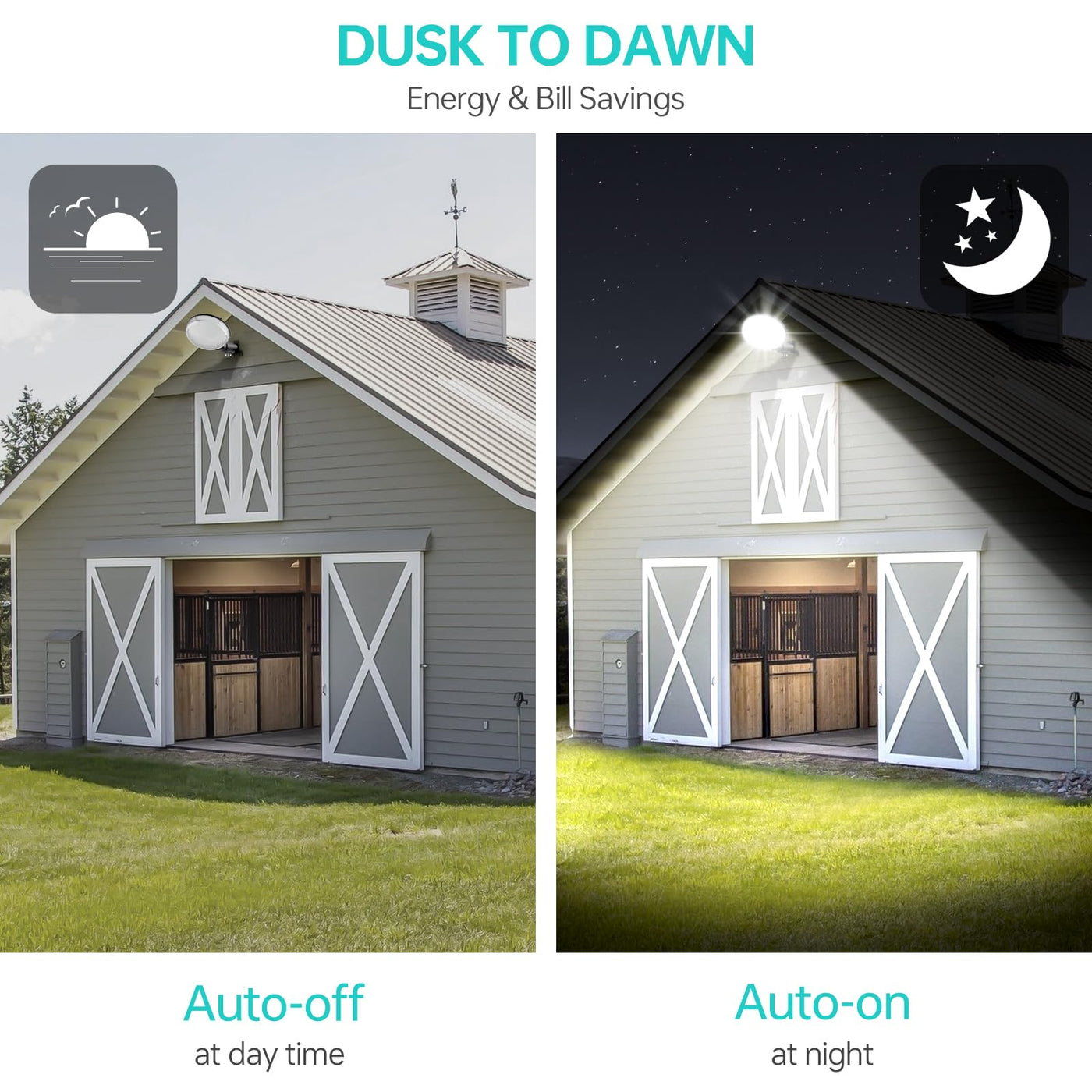 Q: How does the built-in photocell work in the LED barn light?A: The built-in photocell in the LED barn light detects ambient light levels. It automatically turns the light on at dusk and off at dawn, ensuring that the light operates only when needed, which helps save energy and reduce electricity costs.