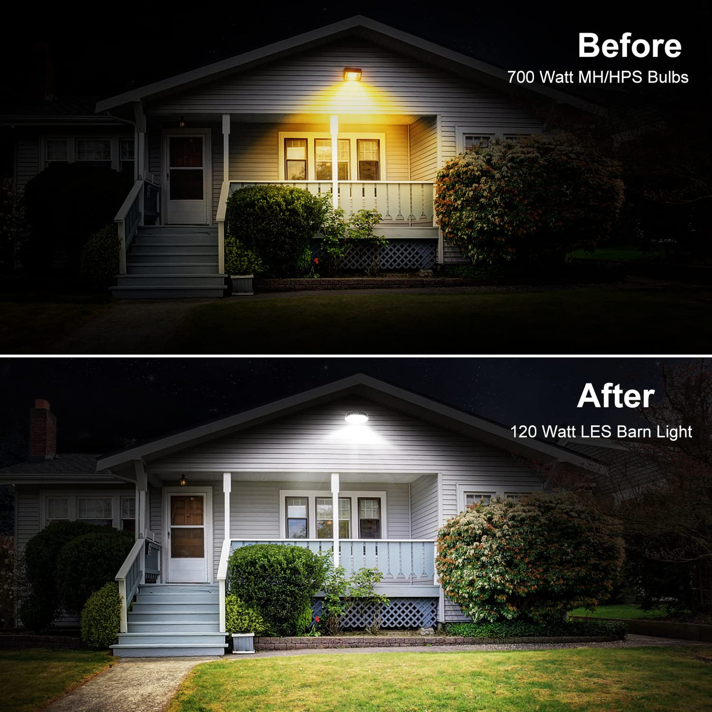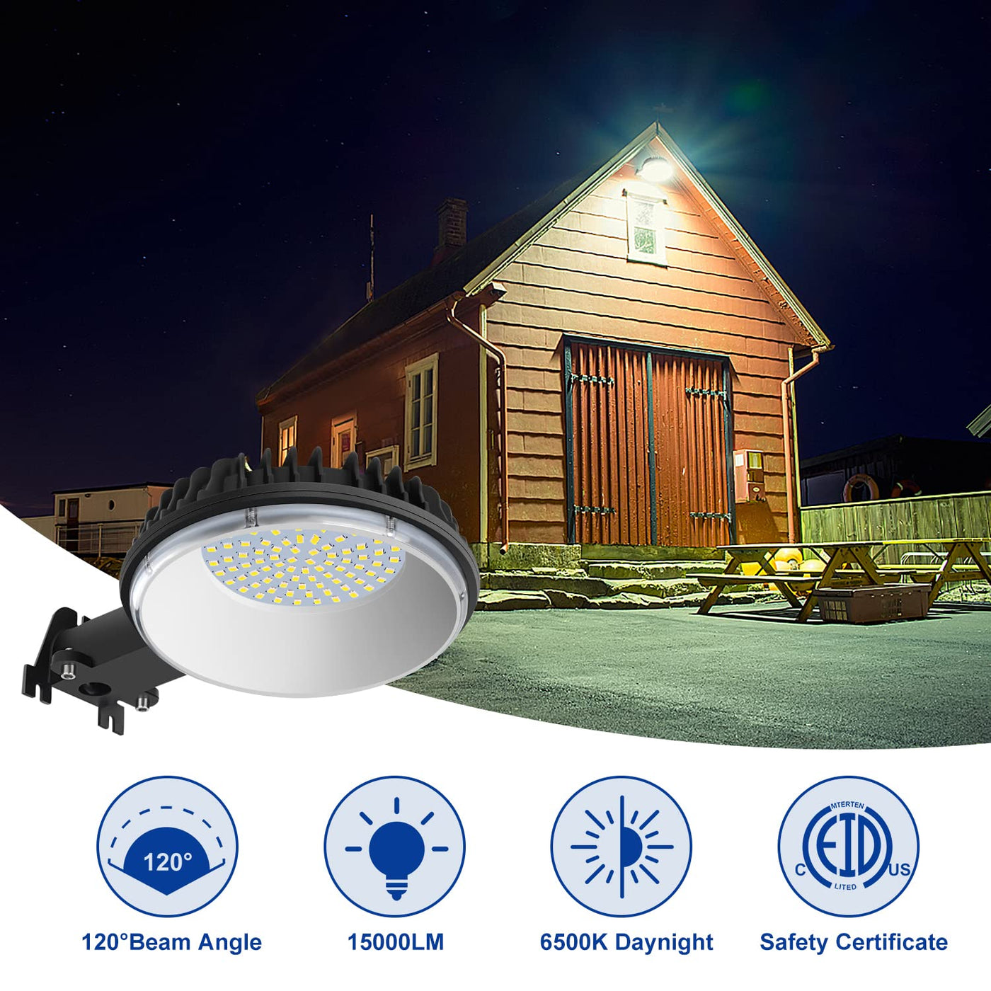 Q: What is the brightness output of the LED Barn Light?A: The LED Barn Light provides an impressive brightness output of 15000 lumens, making it bright enough to illuminate large areas such as backyards, barns, and parking lots.
