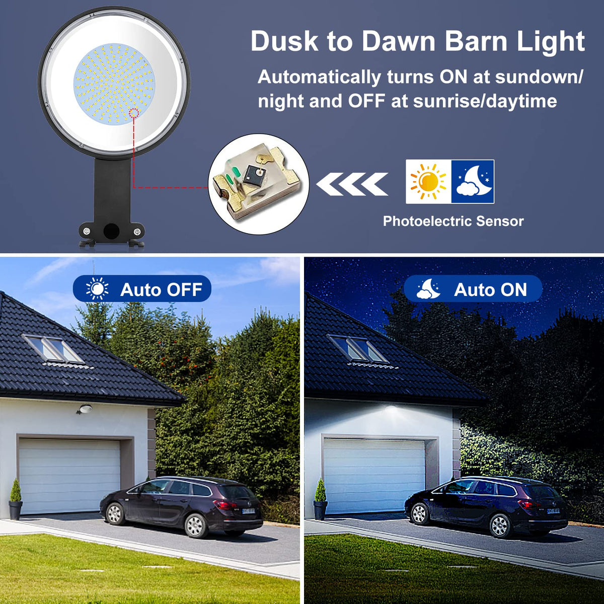 Q: How does the dusk to dawn feature work?A: The dusk to dawn feature uses a sensitive photocell that automatically turns the LED barn light on at night and off during the day, ensuring hassle-free operation.