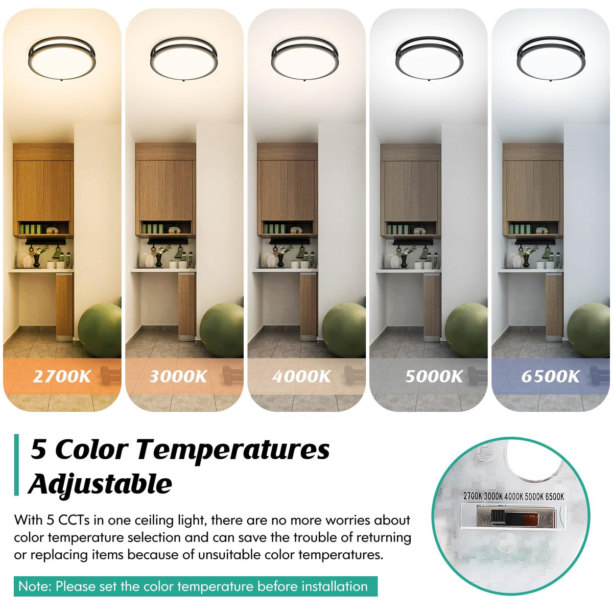 Q: What are the different color temperatures available for this LED ceiling light?A: This LED ceiling light fixture offers five different color temperatures: 2700K Warm White, 3000K Soft White, 4000K Neutral White, 5000K Daylight White, and 6500K Cool White. This versatility allows you to choose the perfect lighting to match your mood and setting.