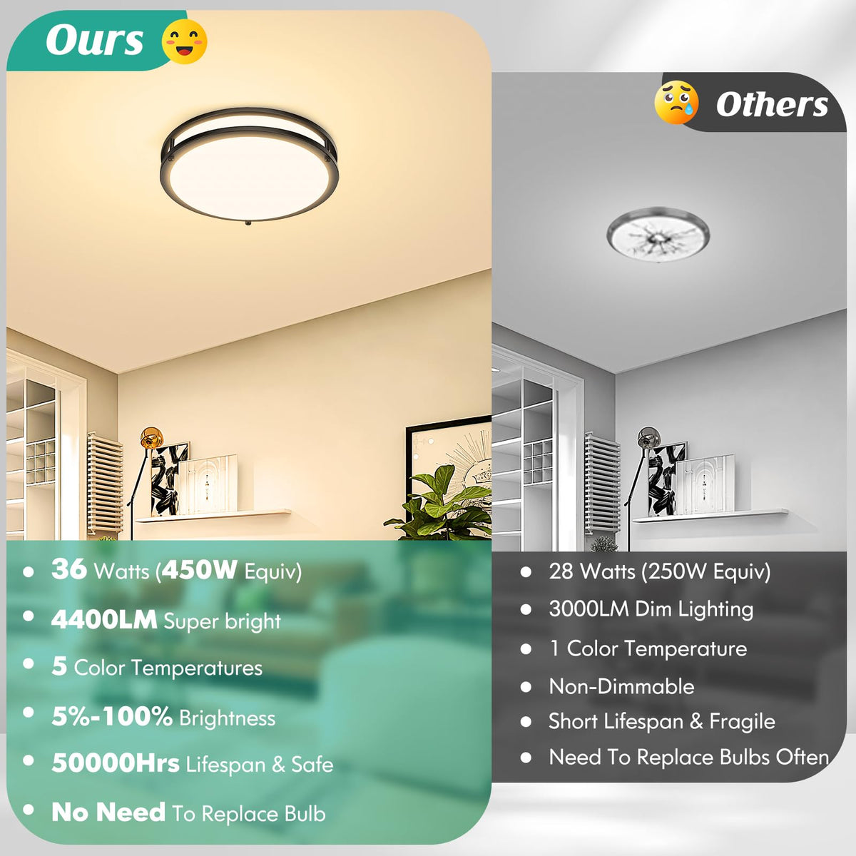 Q: How bright is the LED ceiling light, and is it suitable for large rooms?A: With a brightness of 4400 lumens and a power consumption of just 36W, this LED ceiling light is powerful enough to illuminate large rooms efficiently, ensuring that every corner is well-lit and free of dark spots.