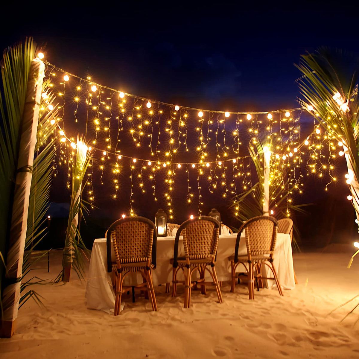 Waterproof & End-To-End Expandable This outdoor Christmas Iciclelights is waterproof design makes it be the best choice for both indoor and outdoor decorations. Extendable Led Outdoor Iciclelights with male and female safe plug, could be extended to up to 3 sets. Note: In theory, it is up to 3 sets of string lights can be linked together, but we recommend you only connect 2 sets to make sure the lights be bright enough. Please keep the power adapter away from any source of water.