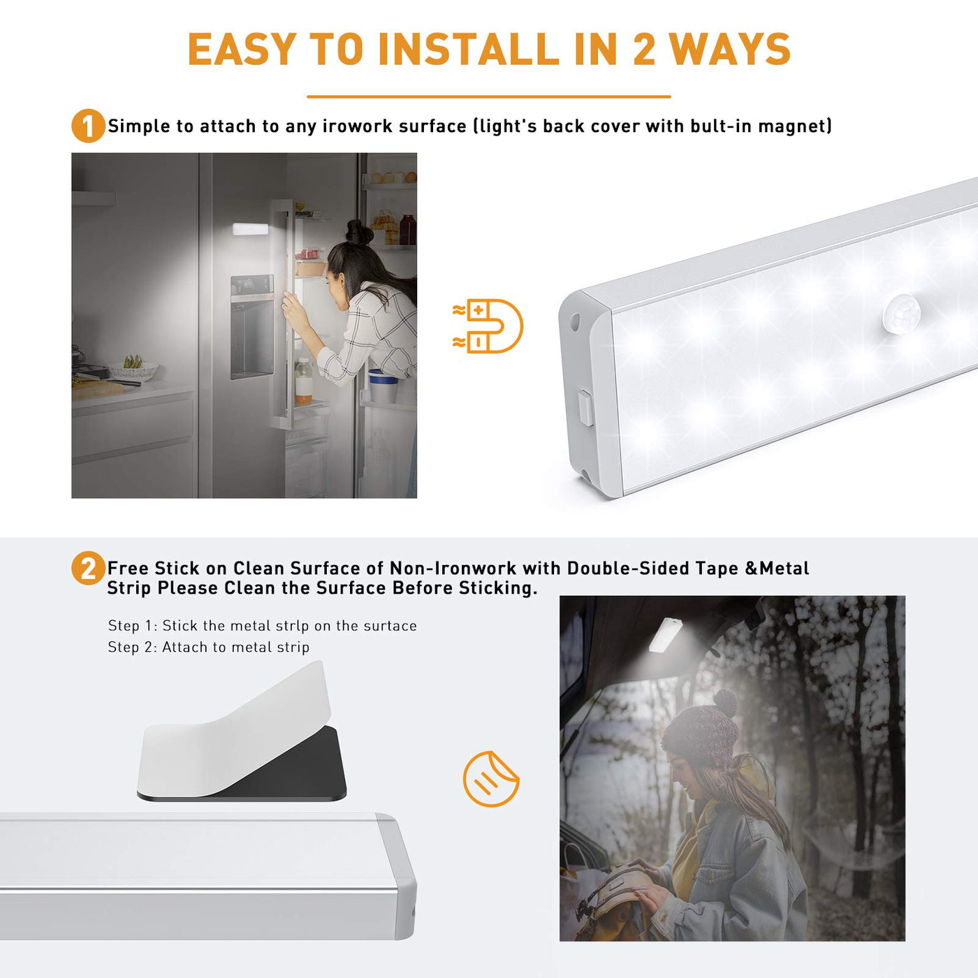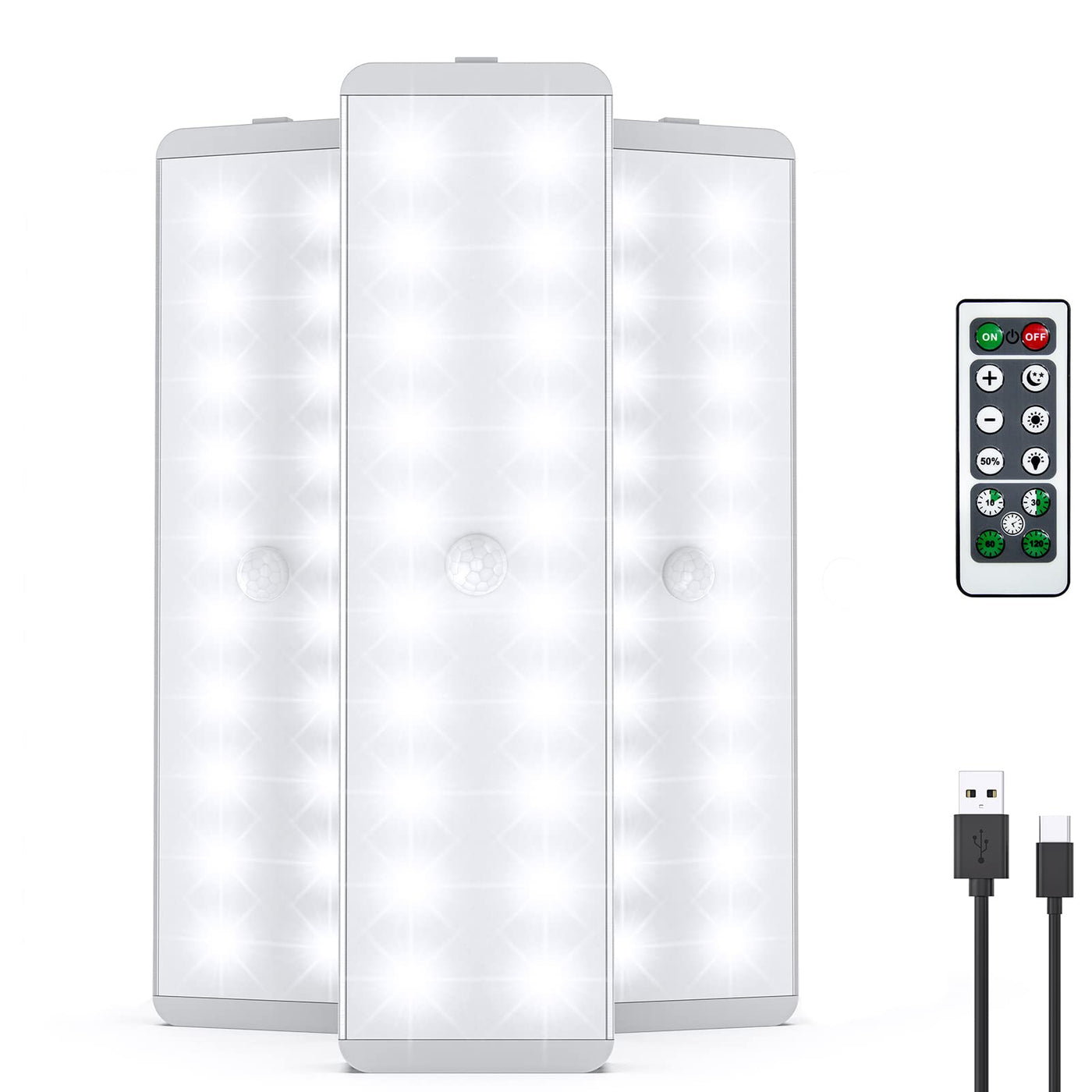 DIMMABLE AND TIMING -- These 3 Pcs dimmable closet lights come with a remote. In ''ON'' mode, the light will turn on all the time, and it can works with the remote control. There are 2 ways of adjustable brightness: ?50% brightness, ? Step-less Dimming: pressing the +/- button of the remote control. And it has Timing Function with: 10, 30, 60 or 120 mins. ( Note: the remote control do not work for ''Auto Mode''. ) | MOTION & NIGHT SENSOR -- These led cabinet lights with 2 sensor modes: Night Mode and Day Mode. They can detect the motion of human in the dark or daytime. Automatically open within 10ft/120
