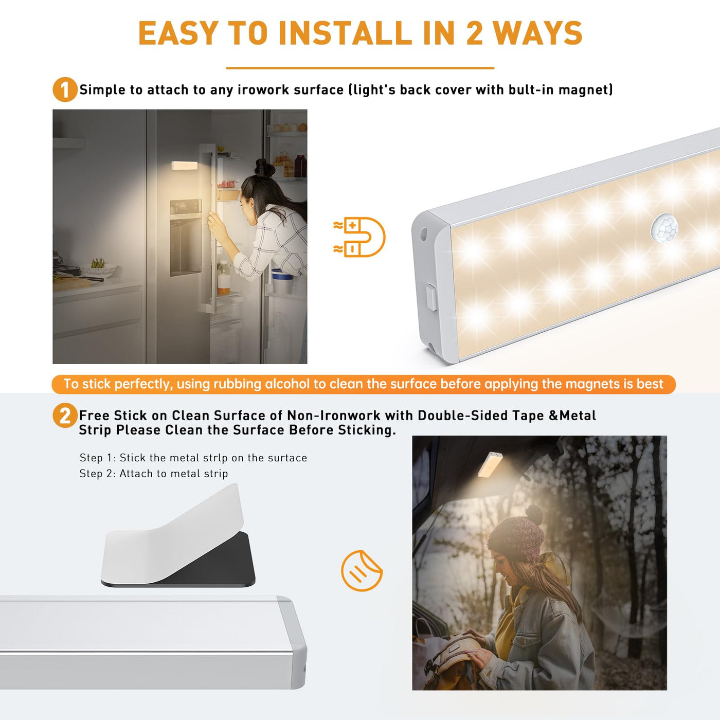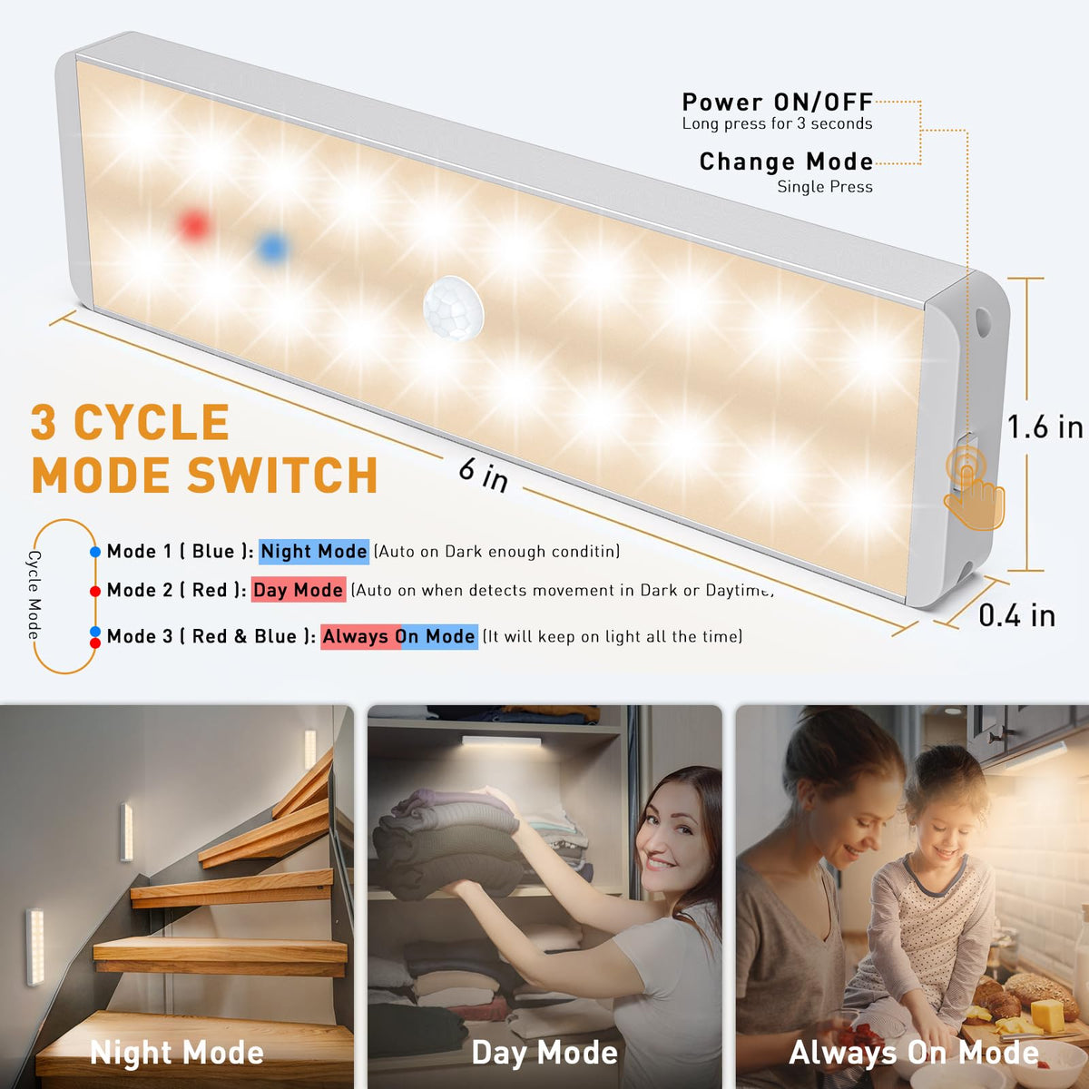 Lightbiz Closet Lights to Provide You with More Convenient and Brighter Life. Lightbiz 20 led motion sensor closet lights, using the passive infrared technology, auto turn on as soon as you are within 10 feet and stay on as long as you are moving. Once you are still for a few seconds or walk out of range, they turn off immediately. These lights can provide excellent lighting at the advantage of being fixed as well as portable if need be. Upgraded Remote Closet Lights:Lightbiz led cabinet lights equip smart remote. You can set the switch, switch the mode, adjust the brightness of the light, and timer off. You can also press the switch to turn on/off the light directly. Specification:- Material: Aluminum alloy+ABS- LED QTY: 20LEDs- Sensing Range: 120, 3m/10ft- Power: 2W- Battery: 800mAh- Operating current: 400-800 mAh- Lumens: 150LM- Operating temperature: 0-80C- LED Life Time: >80,000 hoursCharging Description:Note: When the led closet light is flashing, it proves that the battery is low and it needs to be charged.- Charging: RED light- Charged: BLUE light- Charging Time: about 2-3 hrsPackage Included:- 3 x 20-LEDs motion sensor light- 5 x Magnetic 3M tape- 1 x USB Cable- 1 x User ManualTips: 1.Please do not put two lights too close, they will interact with each other in ''AUTO'' mode.2.In Motion sensor mode: this light can only be turned on in darkness environment.If for any reason you are not completely satisfied with your purchase, please contact us. We will help customers solve problems with the best service attitude.