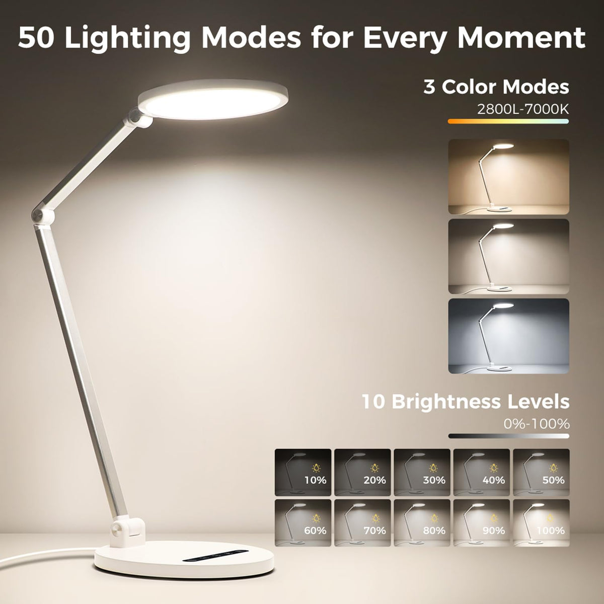 Transform your workspace with this versatile LED desk lamp designed for modern professionals. Perfect for video conferencing, computer work, reading, and studying, this lamp features smooth stepless dimming from warm to cool white light (3000-7500K) with exceptional color rendering. The flexible gooseneck arm allows precise positioning, while the sturdy clamp mount saves valuable desk space. Powered via USB with the included 10W adapter, this lamp delivers up to 800 lumens of flicker-free illumination. The sleek white finish and contemporary design complement any office setup. The 8-inch diameter light panel provides even illumination across your workspace, and touch controls make adjusting brightness effortless. With its metal construction and matte finish, this lamp combines durability with style. The 6-foot cable ensures convenient placement, while the clamp mount securely attaches to desks, tables, or workbenches. Whether youre working remotely, attending virtual meetings, or burning the midnight oil, this lamp delivers the perfect lighting solution for your needs.