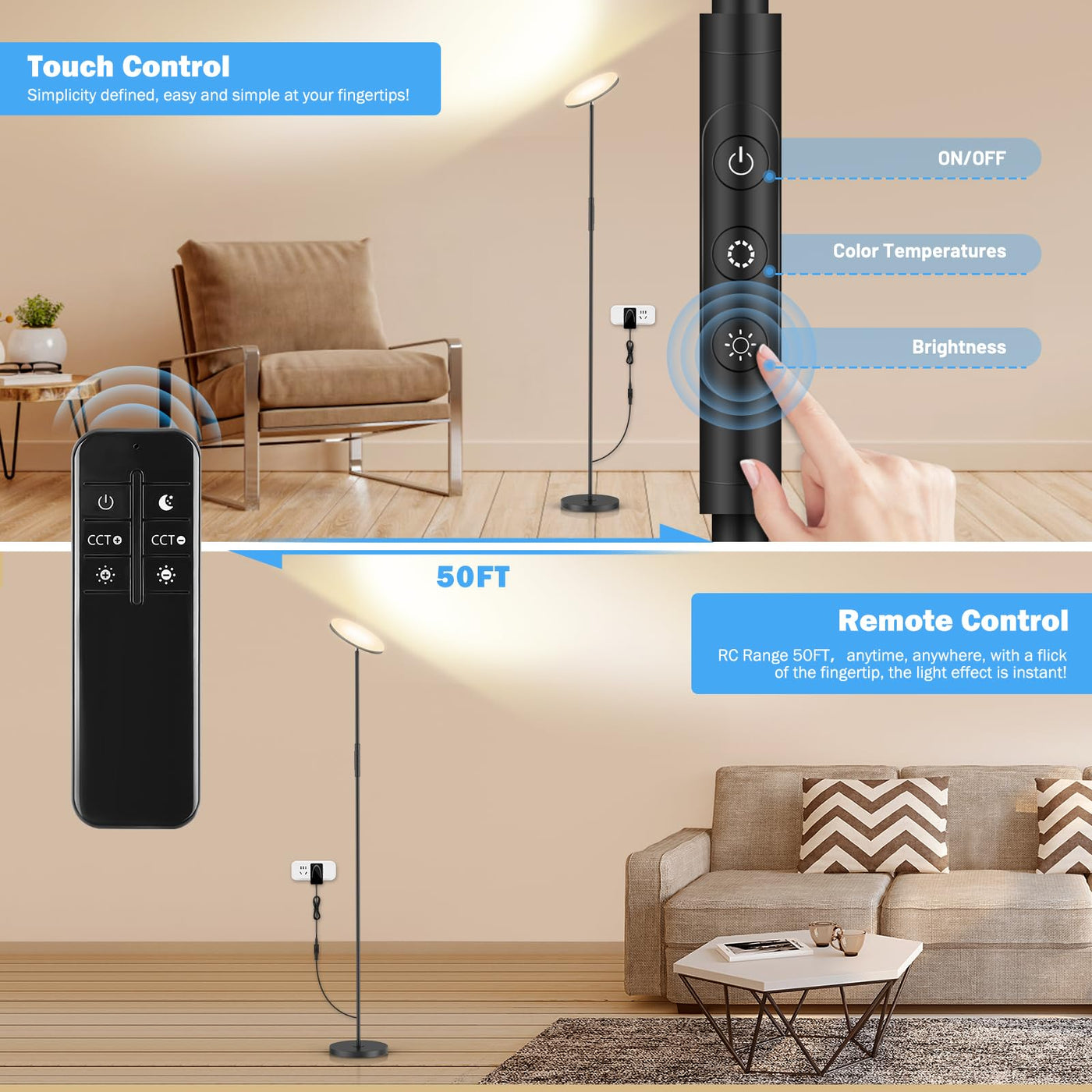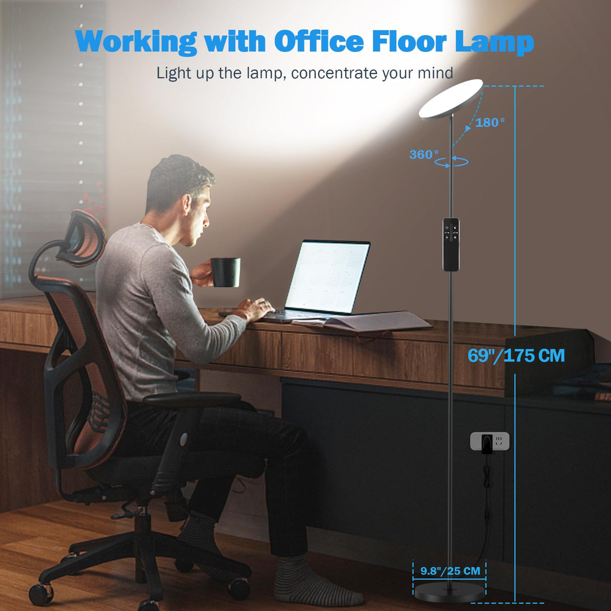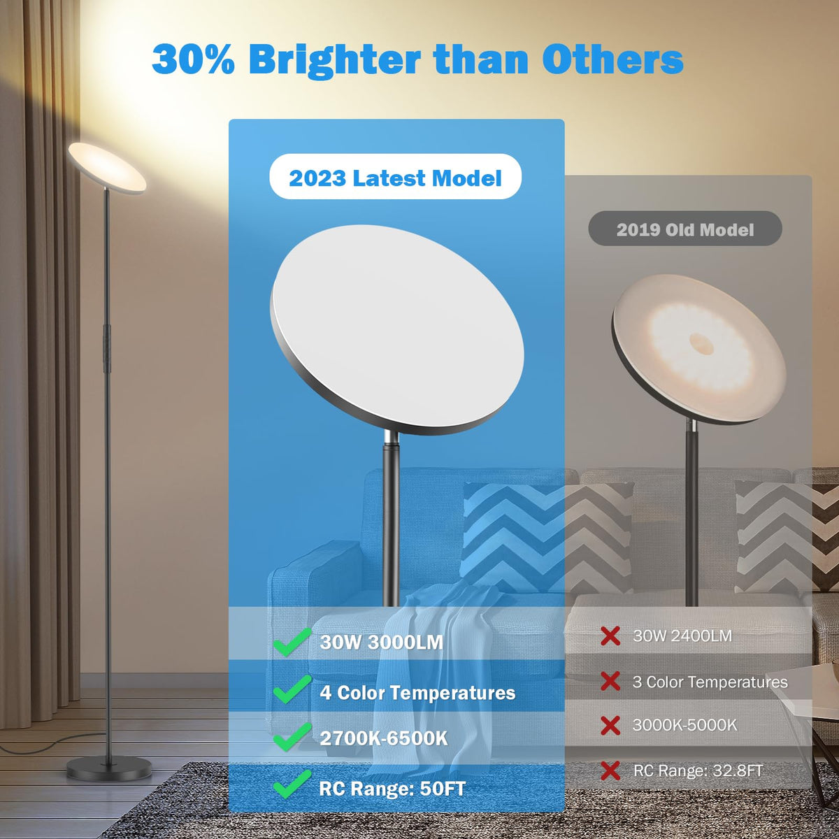 Q: What are the benefits of the 3000LM brightness in the LED floor lamp?A: The 3000LM brightness provided by this LED floor lamp makes it nearly 30% brighter than similar models, ensuring ample lighting for various activities such as reading, working, or relaxing in your living room or bedroom.