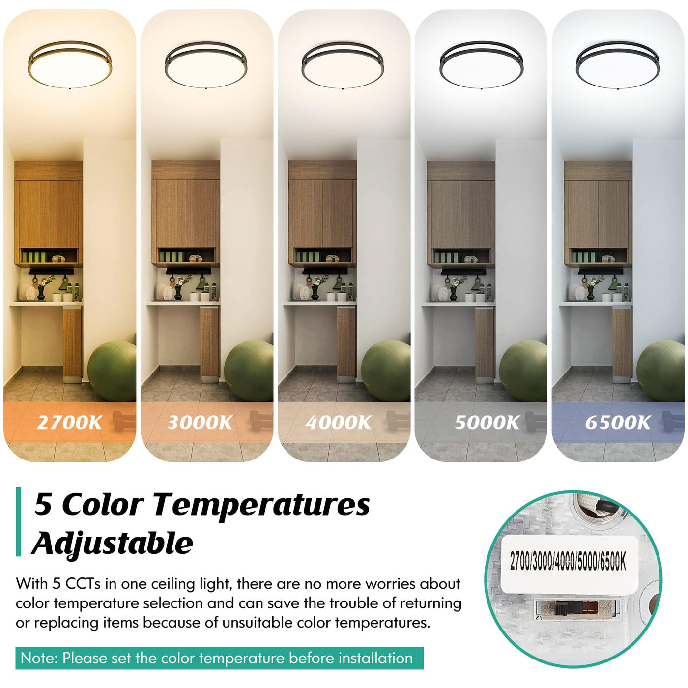 Q: What are the different color temperatures available for the LED Flush Mount Ceiling Light?A: The LED Flush Mount Ceiling Light offers five selectable color temperatures: 2700K Warm White, 3000K Soft White, 4000K Neutral White, 5000K Daylight White, and 6500K Cool White. This allows you to customize the lighting to match your mood and setting.