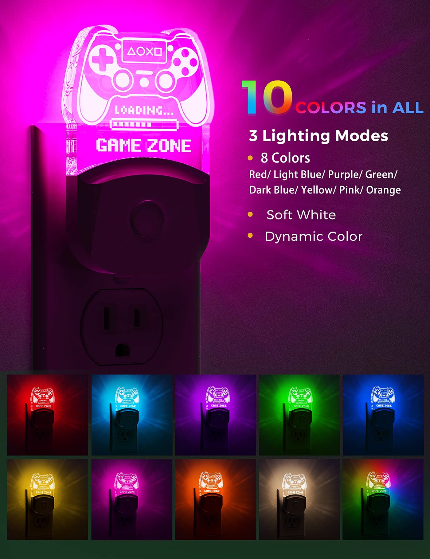Main Features : V Dusk To Dawn Sensor, Auto On/Off V Rgb+Soft White To Provide More Choices V Dynamic Light Mode Helps Create A Colorful Life And Pause In The Color You Want. V Energy Efficient Light Makes A Green Life V Charming Glow, Suitable For Boys Gift, Game Room Decor Specifications: Color: Multicolored Wattage: 0.5W Voltage: 110-130V, 60Hz Lumen: 30 Lumen View Angle: 180 Degree Note 1.Keep Your Hands Dry When Using The Lights! 2.Just Be Attention To Keep A Certain Distance(Over 1M) Between Two Night Lights, Otherwise It May Cause Interference.3.Please Do Not Use It In Inflammable And Explosive Place.