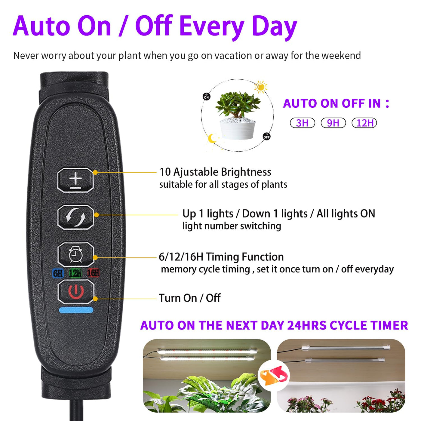 Q: What timer settings are available on the LED Grow Light Strips?A: The LED Grow Light Strips feature an automatic timer with cycle memory that allows you to set the lights to turn on and off at intervals of 6, 12, or 16 hours. This ensures your plants receive consistent light exposure without manual operation.