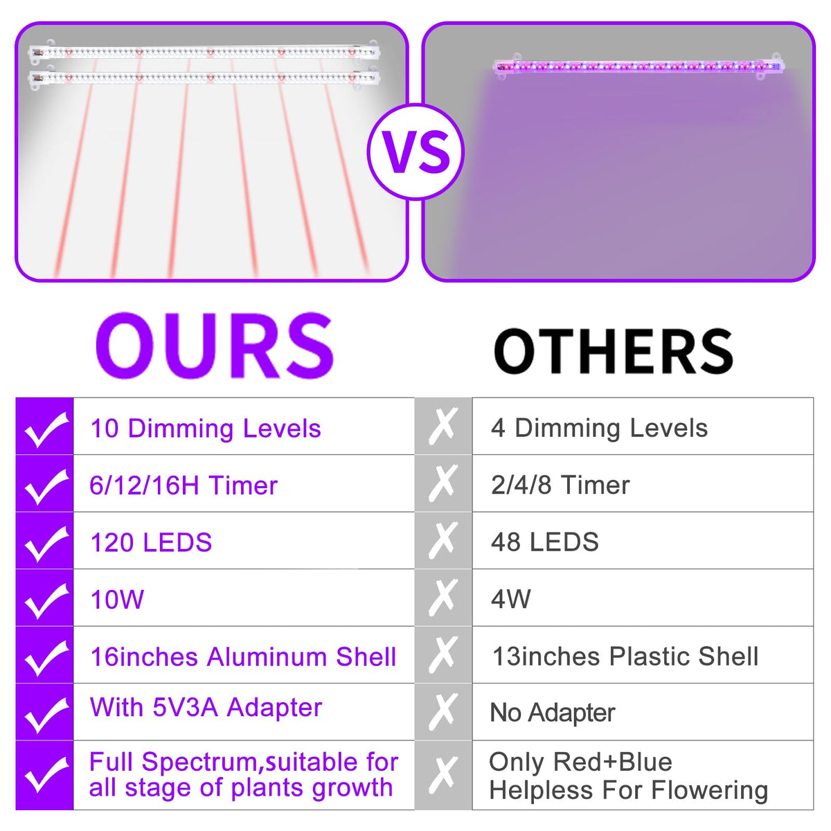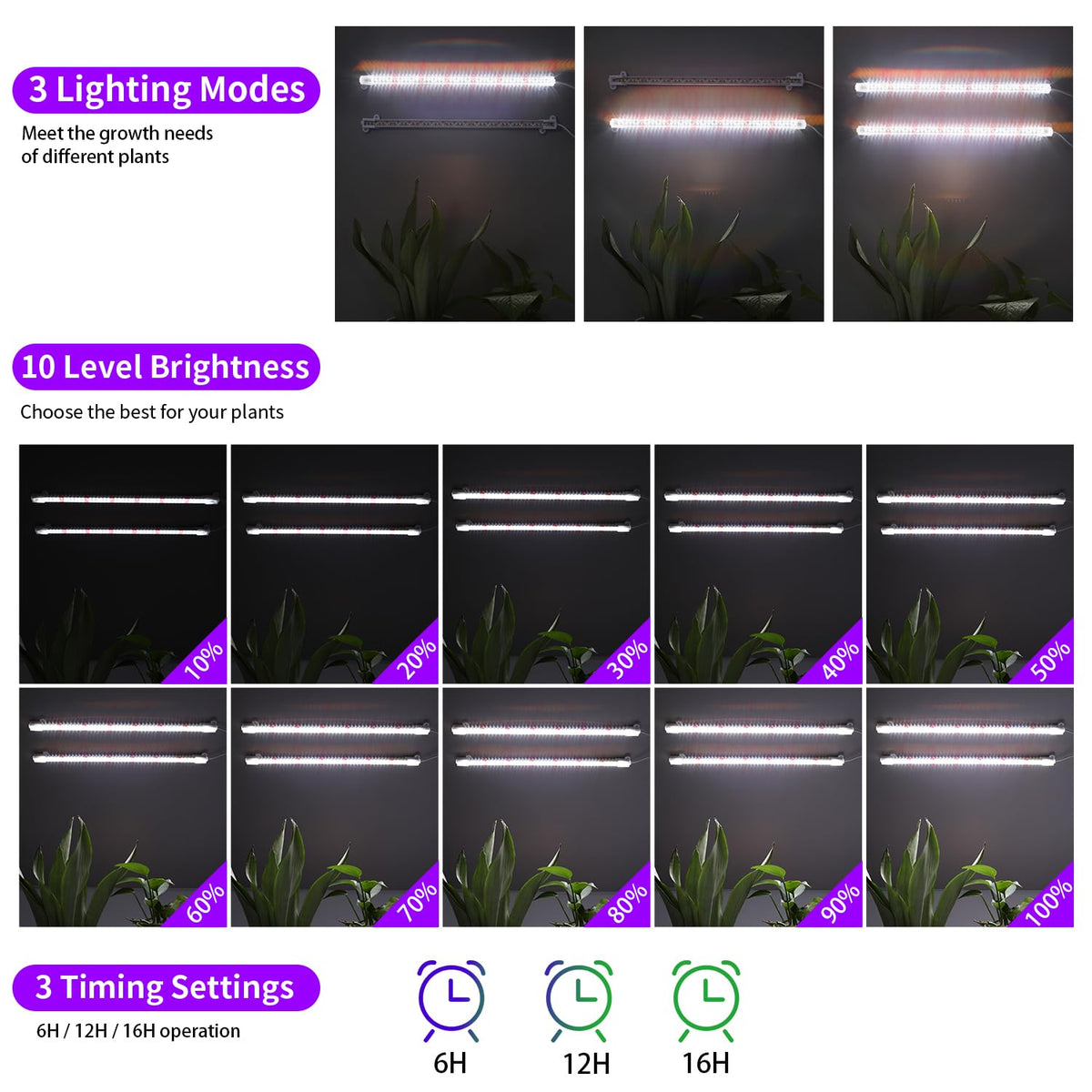 Led Grow Light Strips For Indoor Plants Full Spectrum, 240 Leds,15.7‘’ With 4 Install Methods, 6/12/16H Timer, 10 Dimmable Levels, 3 Switch Modes For Seedling Succulent Sunlike Strip (2 Head 2 Pack)