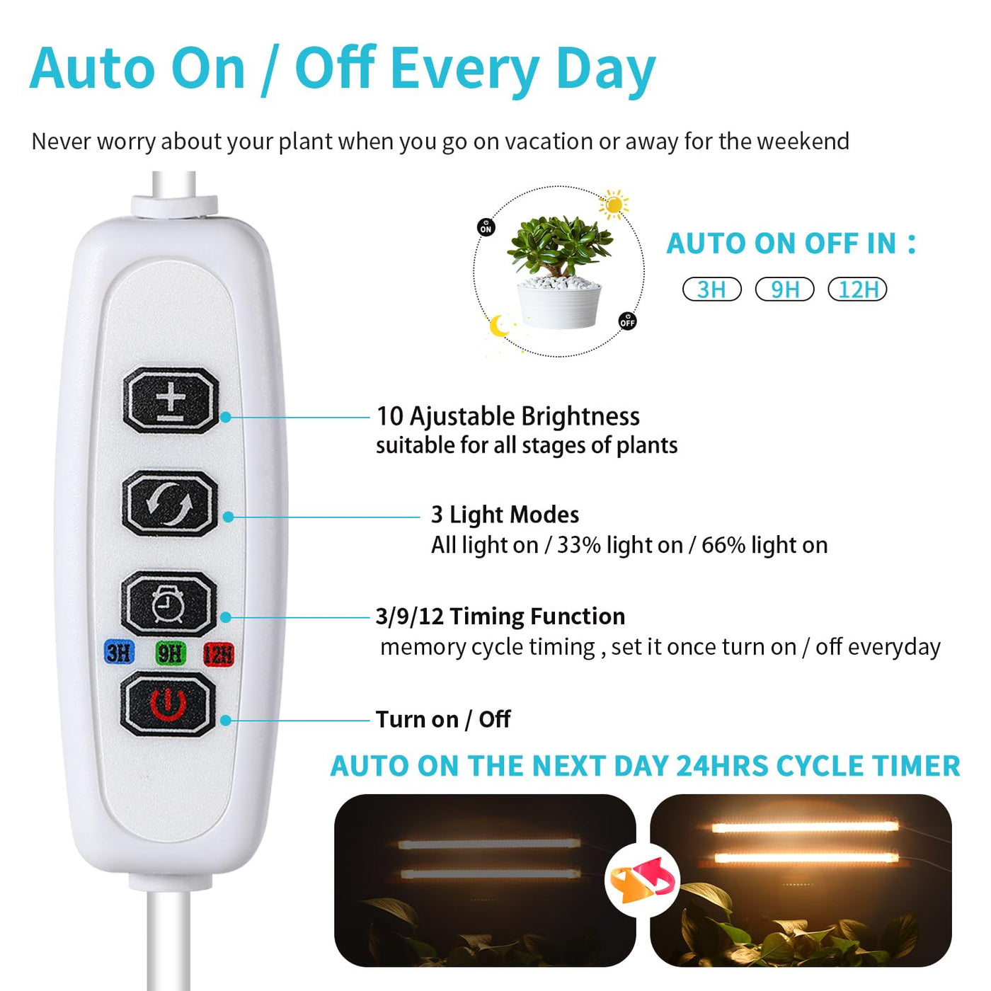 Q: How does the timer function work on these LED grow light strips?A: The grow light comes with an auto on/off cycle memory timer. You can set it to turn on and off automatically every day for 3, 9, or 12 hours, ensuring your plants receive consistent light without manual operation, which is especially useful when you're at work or on vacation.