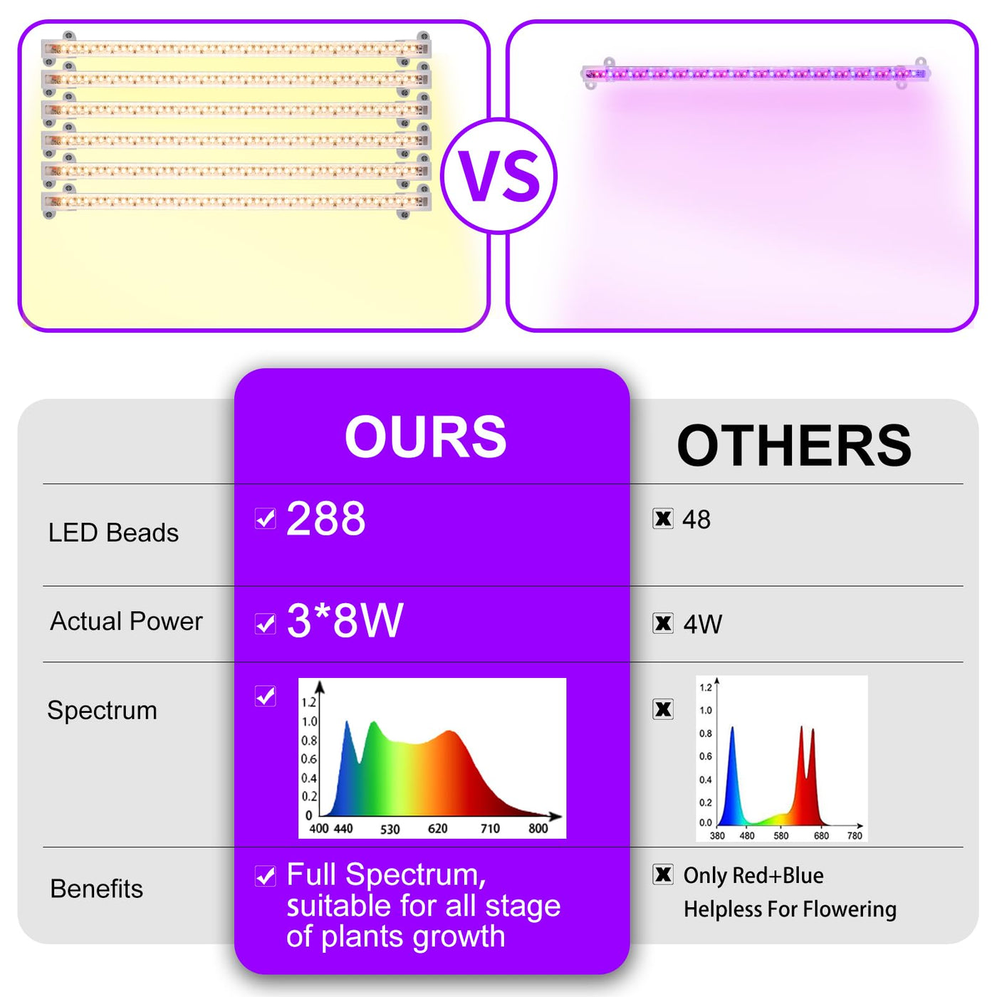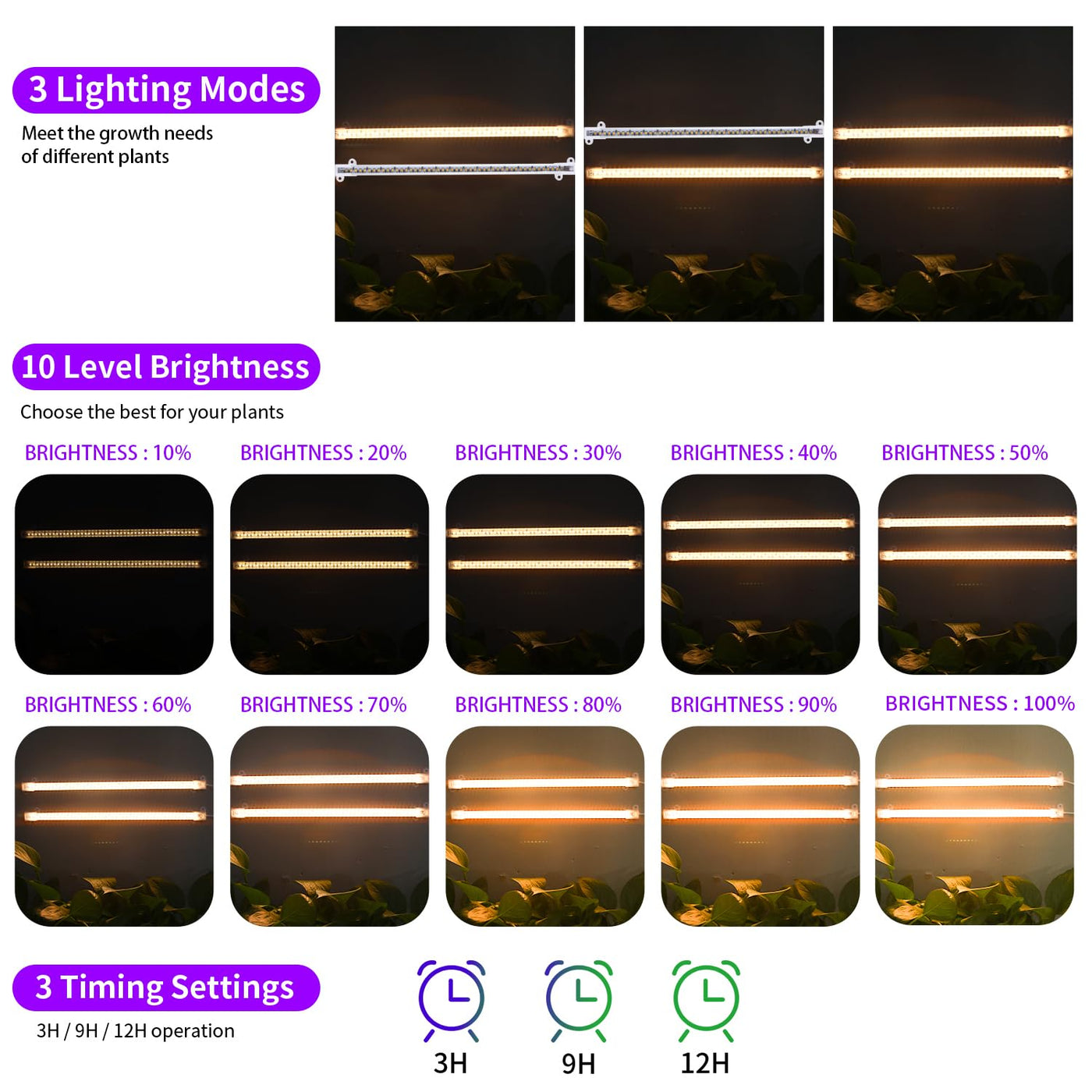 RWNTAO LED Grow Light adopts full spectrum design, which is a spectrum that simulates sunlight. This full spectrum provides the most complete light source for plant growth, just like sunlight, allowing plants to grow more natural, brighter and more luxuriant.