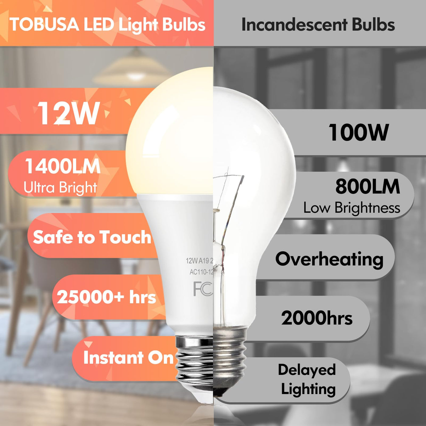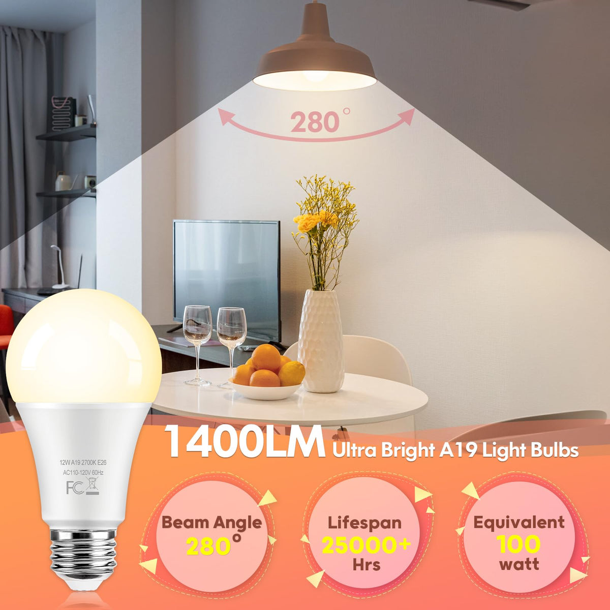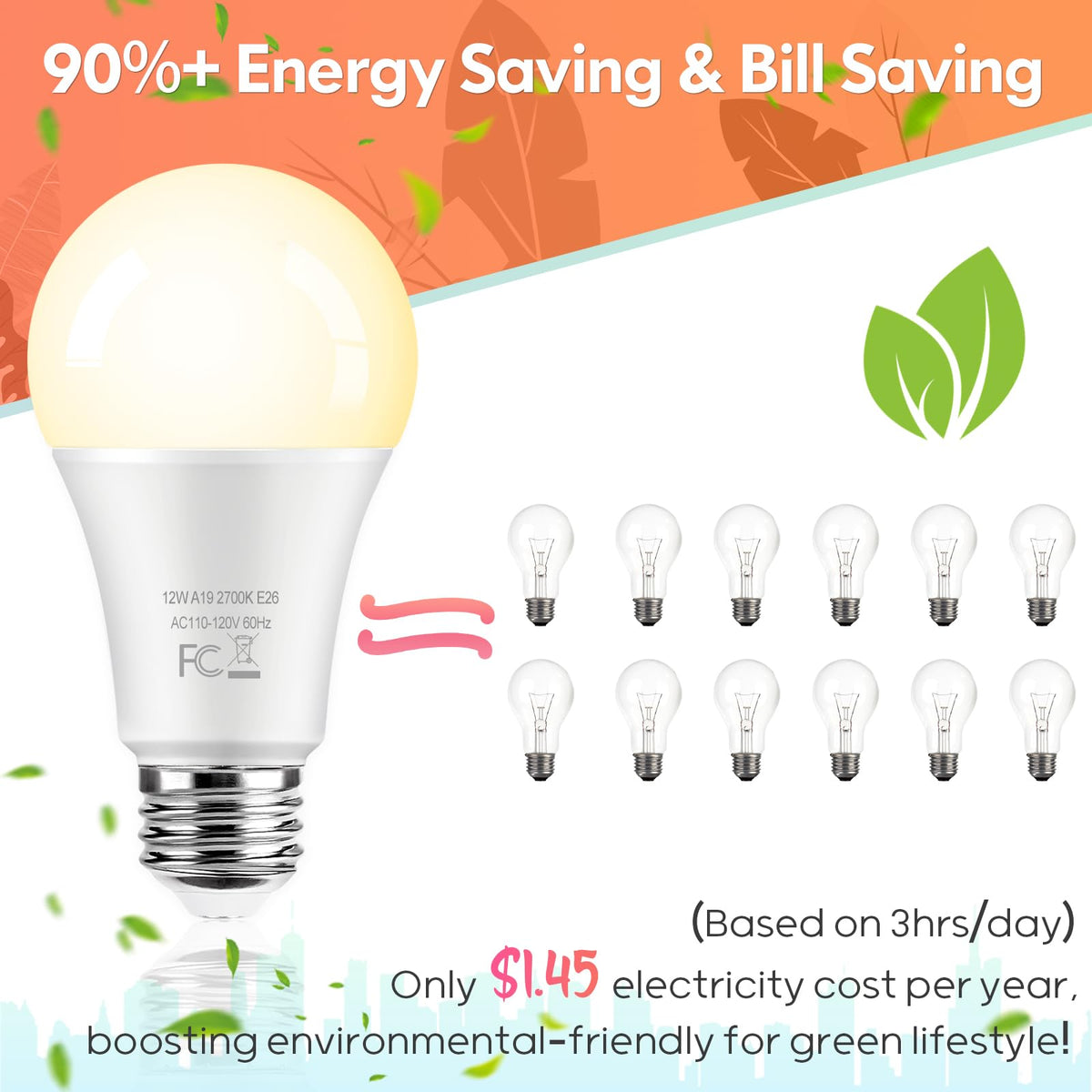 ???????????+ ?????????? ???????? ?????????????????Our A19 LED light bulbs are equipped with superior LED chips, ensuring a lifespan of over 25,000 hours-equivalent to 22.3 years based on 3 hours of daily usage. Unlike other brands with shorter lifespans, our led bulbs help you reduce costs and eliminate the hassle of frequent replacements | ????????????? ?????????????????? & ??????-?????????????????Our 12-pack LED light bulbs are 100watt incandescent bulb alternative, consuming only 12W of LED power. This results in over 90% energy savings compared to traditional bulbs. Featuring excellent heat dissipation, these E26 A19 LED bulbs emit a stable 2700K warm white light at a ultra high brightness of 1400LM with no flicker or strobe. Constructed from eco-friendly materials, they