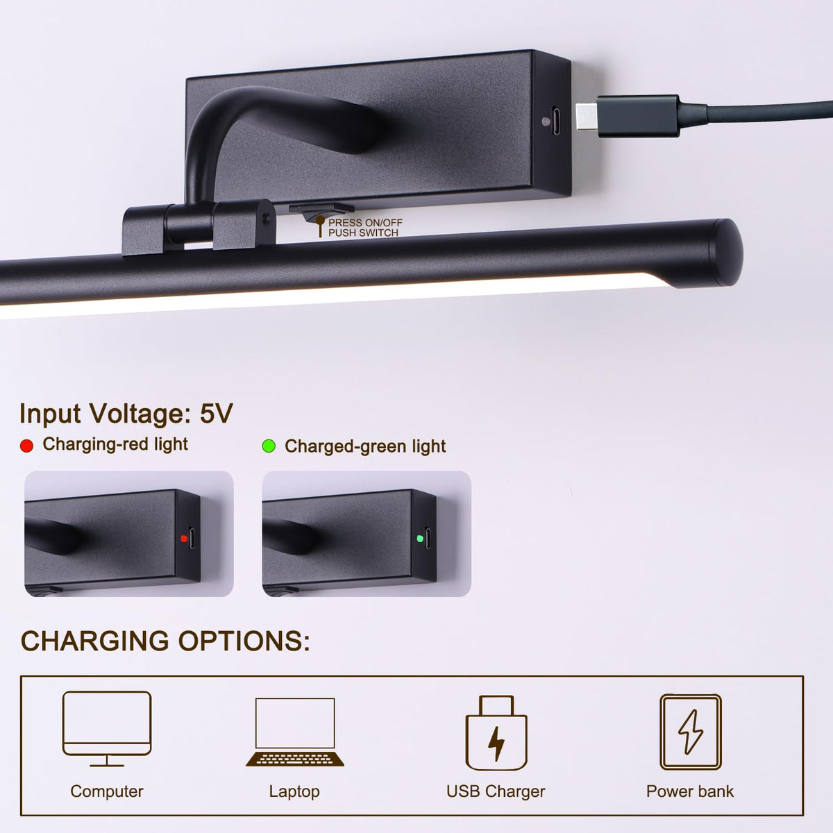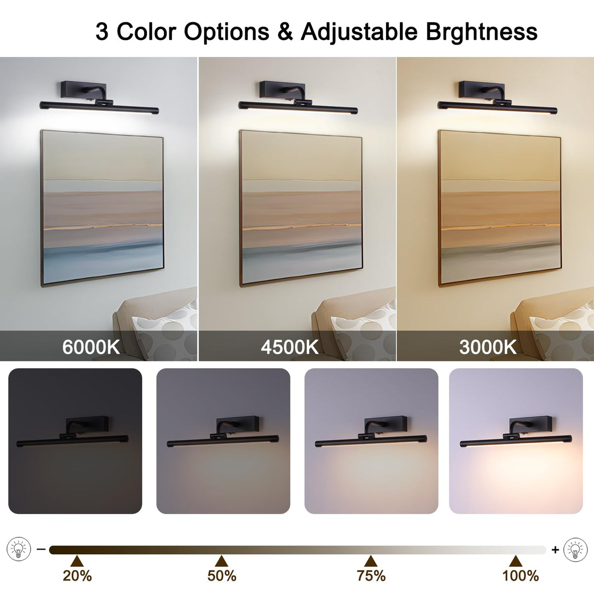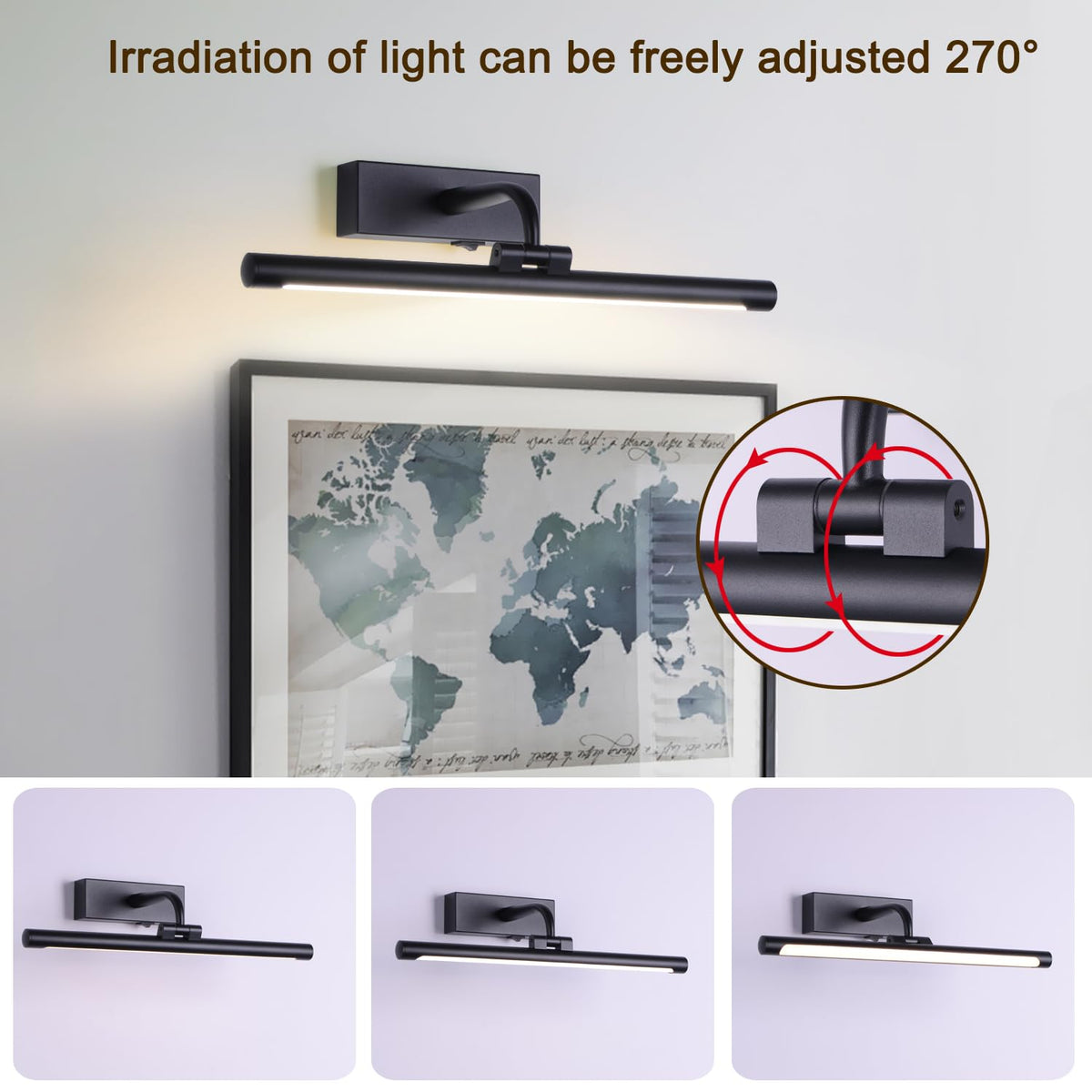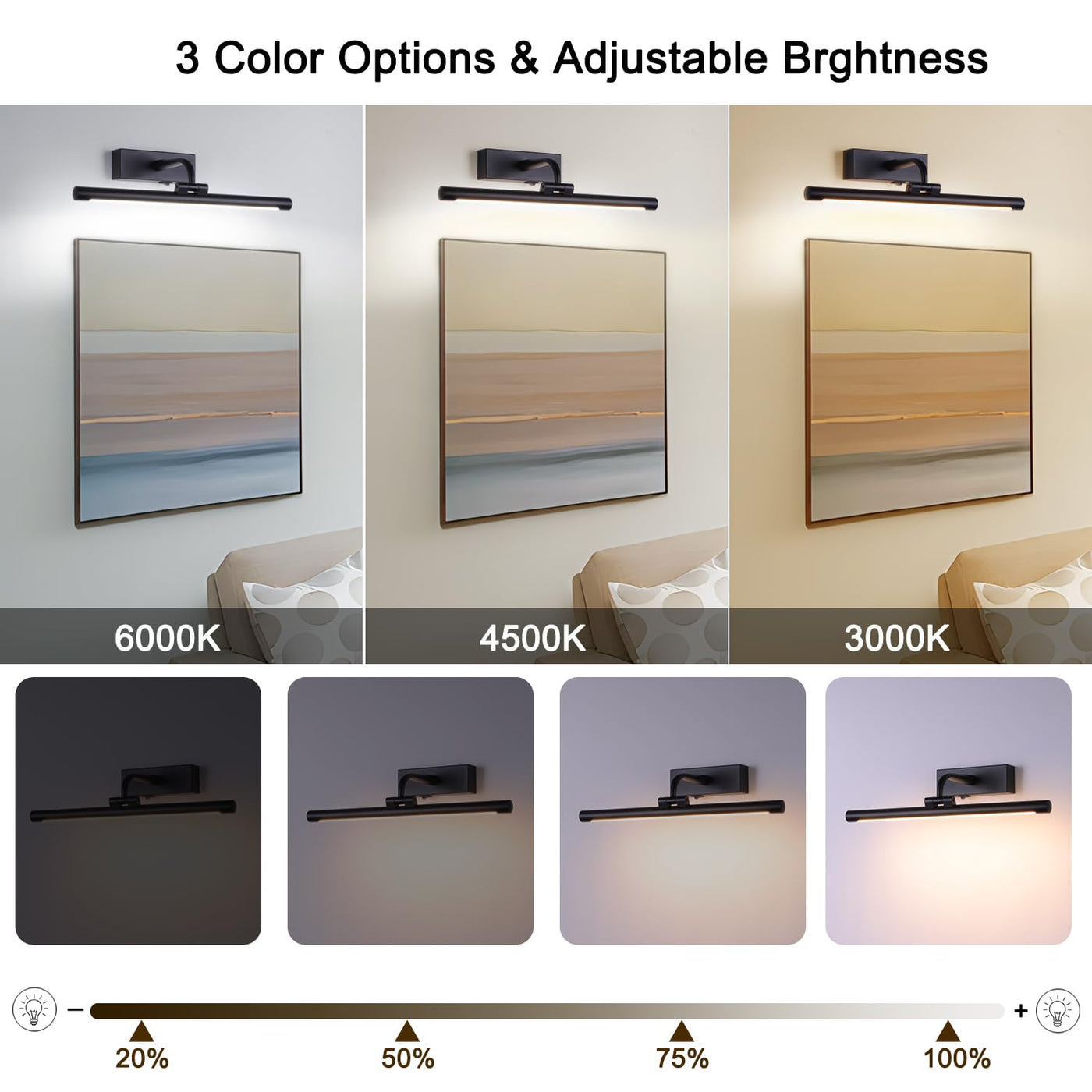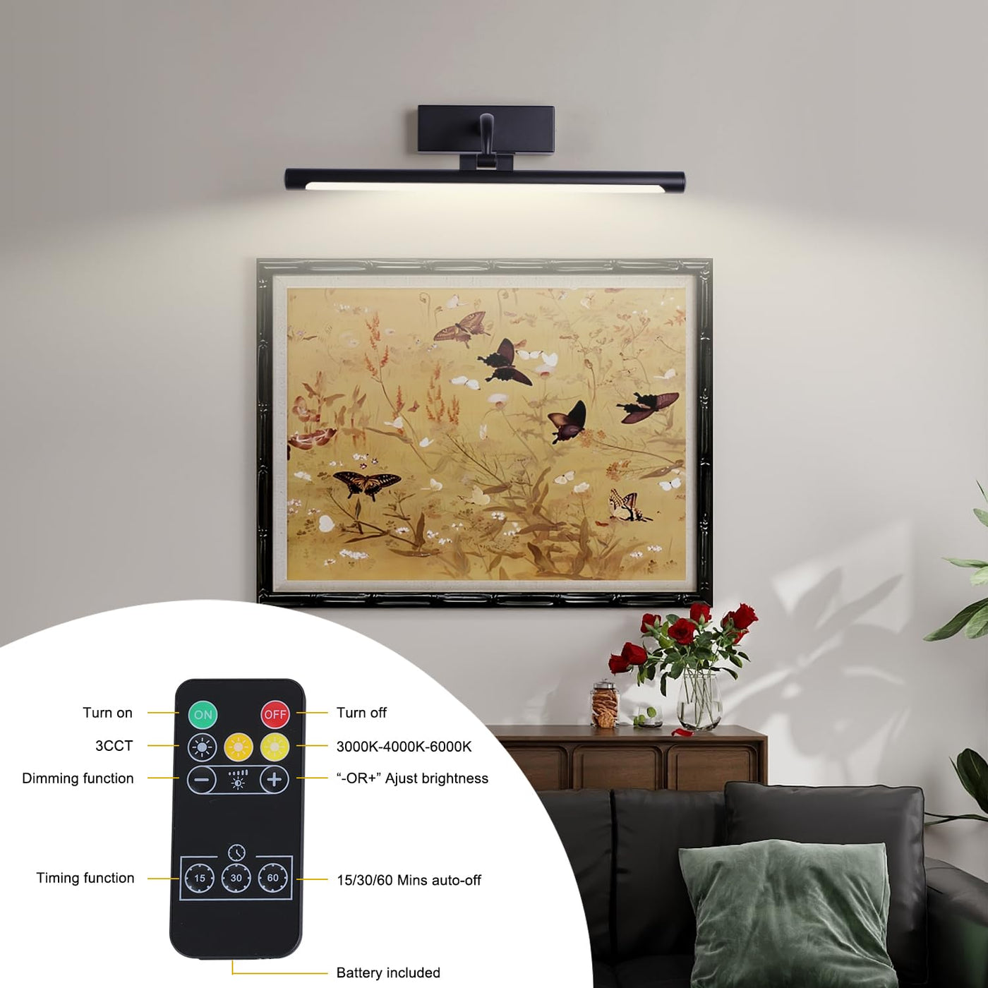 ??This wireless picture light offers versatile display and accent lighting. Rechargeable and battery operated, it provides bright yet soft LED illumination that enhances artwork, photographs or d?or without distracting from the pieces themselves. ??The dimmable light head pivots and extends on a durable swing arm, allowing precise positioning to highlight details. ??Convenient remote control allows adjustment of brightness and settings from across the room. ??A built-in timer automatically powers down the light after a set duration, helping to conserve battery life. ??Sleek and unobtrusive, this wireless lamps for wall brings out the beauty in your displays without wires or hassle. ??Please Kindly Note :Picture Light Color is A Little Orange Gold, Which is Suitable for Lighting Up Your Gold and Copper of Picture Frame .And It's Made of Plastic and Aluminum to Make it More Flexible to Rotate Light Head.Please feel free to contact us if you have any question. ??Dimmable and Soft 3 Brightness Modes: Adjust ''20%'' and ''100%'', Warm White(3000K) and Nature White (4500K),Cool White (6000K) by Remote Controller. ??Timer Preset Turn OFF : Freely Set Timer with 15, 30, 60, and 120 Minutes. You can save more batteries power . ??270 Degree Rotatable Light Tubes : You can adjust multi-angle Light as you like. ??Specifications: Lumens: 300 LM Run time: 60 Hours Power Source:3*AA Battery( include) Color Temperature: Warm White (3000K),Nature White (4500K),Cool White (6000K) Lifespan: 30000 Hours ??Package: 1*Picture Light 1*Remote