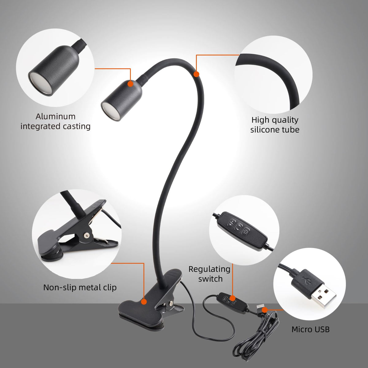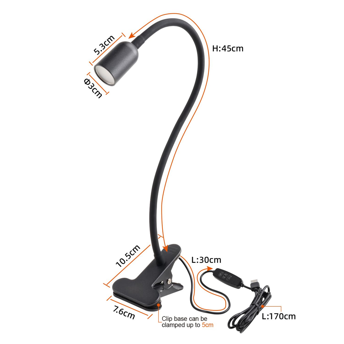 This Led Reading Light Is A Versatile And Functional Lighting Solution Designed For Beds, Desks, And Dorms. Here Are Its Key Features: 1. Flexible Mounting: Featuring A Sturdy Clip-On Design, It Securely Attaches To Bed Headboards, Desks, Or Shelves With A Maximum Clamp Thickness Of 5 Cm. This Makes It Perfect For Tight Spaces Like Dorm Rooms, Small Bedrooms, Or Compact Workspaces. 2. Dimmable Light: With A Power Output Of 3W And A Maximum Brightness Of 300 Lumens, This Lamp Offers Adjustable Brightness Levels. It Allows You To Customize The Light Intensity For Reading, Studying, Or Relaxing, Ensuring Optimal Comfort Without Straining Your Eyes. 3. Adjustable Color Temperature: Choose Between 3000K (Warm White), 4000K (Neutral White), Or 6000K (Cool White) To Suit Your Needs And Preferences. 4. Flexible Gooseneck: The Gooseneck Design Provides 360-Degree Adjustability, Letting You Direct The Light Precisely Where It'S Needed. 5. Usb-Powered: Powered By A Usb Connection, It Is Compatible With Power Banks, Laptops, Or Wall Adapters, Ensuring Portability And Convenience. This Compact And Efficient Lamp Is Perfect For Book Lovers, Students, And Professionals Seeking Focused And Adjustable Lighting.