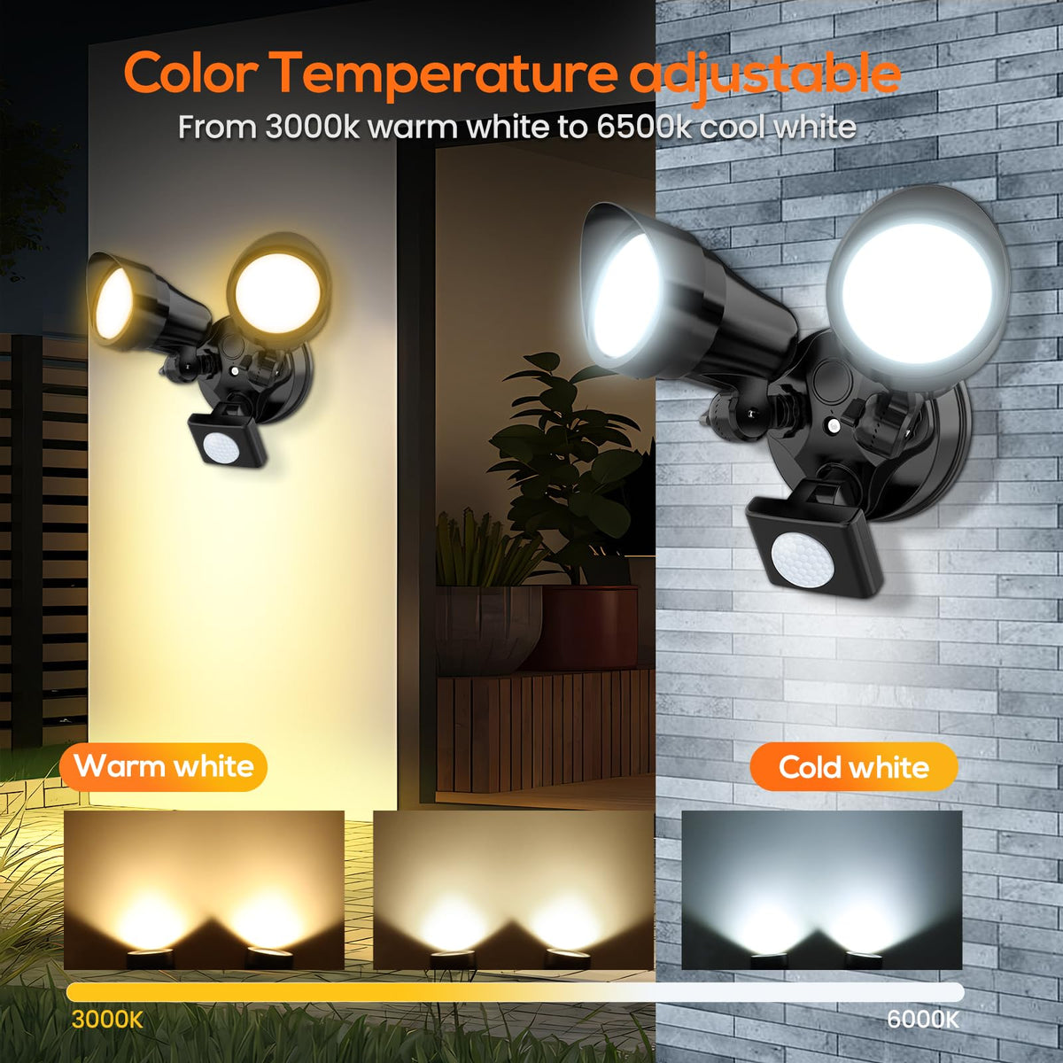 Q: What is the brightness and color temperature range of the LED Security Lights?A: The LED Security Lights provide a brightness of 2000 lumens and feature an adjustable color temperature range from 3000K (warm white) to 6500K (daylight), allowing you to customize the lighting to your preference.