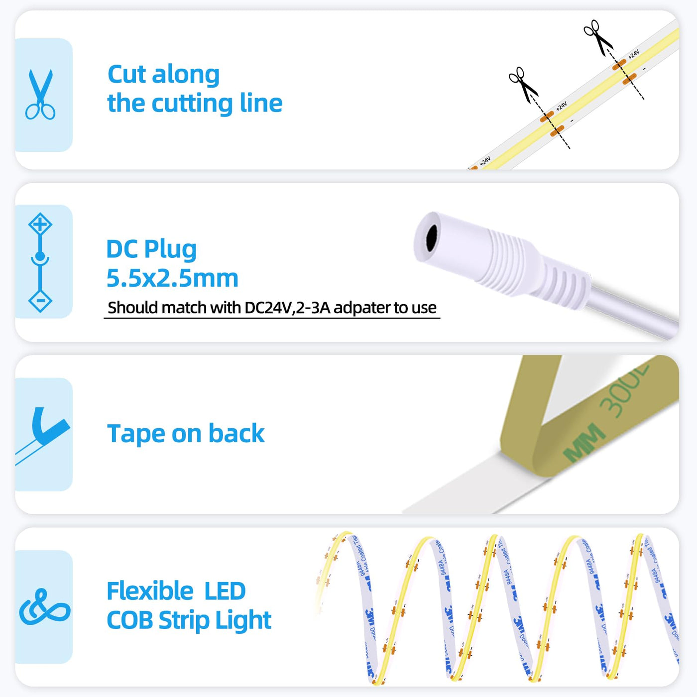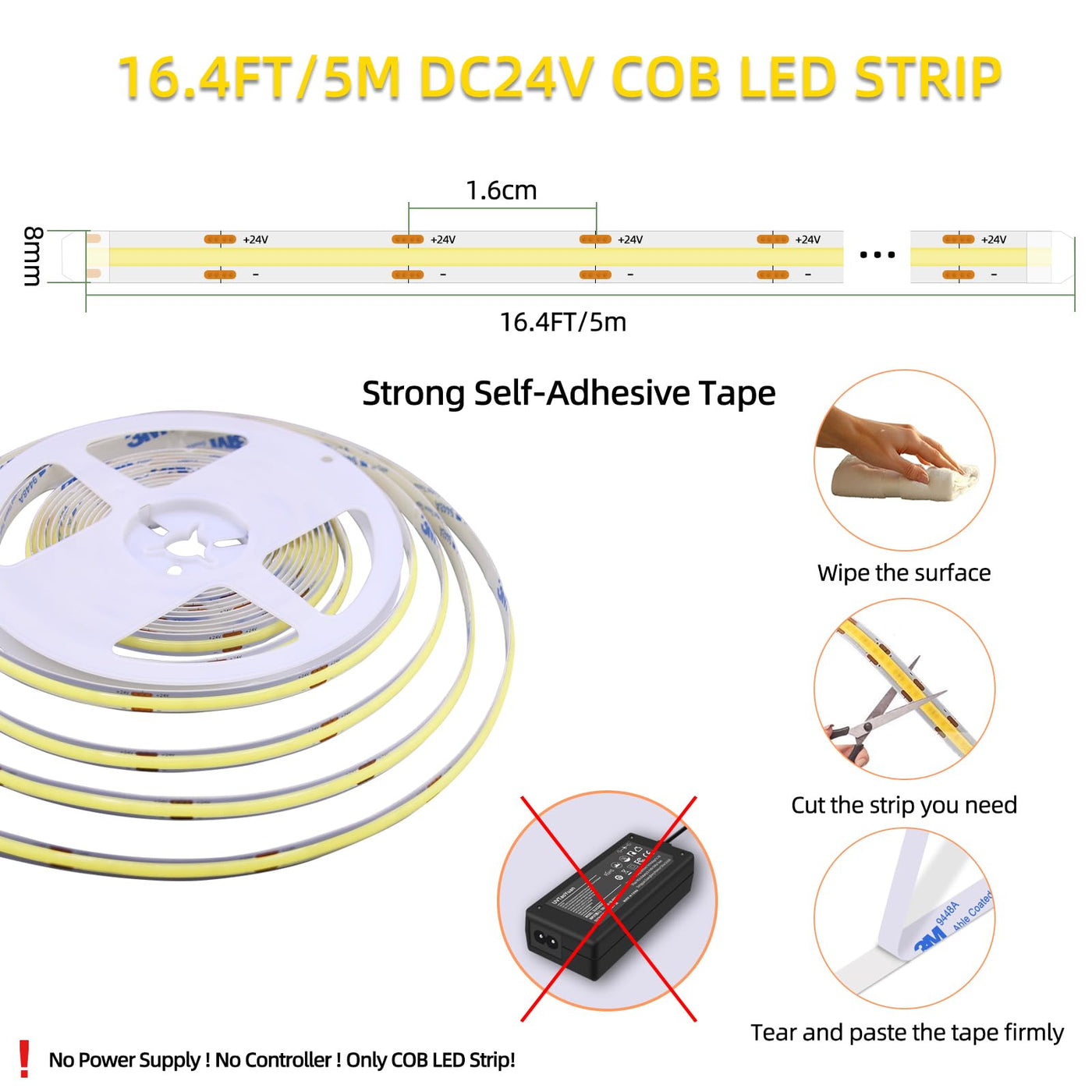 Led Strip Lights 24V Cob Led Warm 3000K Super Bright Led Strip 16.4Ft 5M Dotless High Density Cuttable Flexible For Home Diy Cob Led Commercial Lighting Projects (Power Supply & Dimmer Not Included)