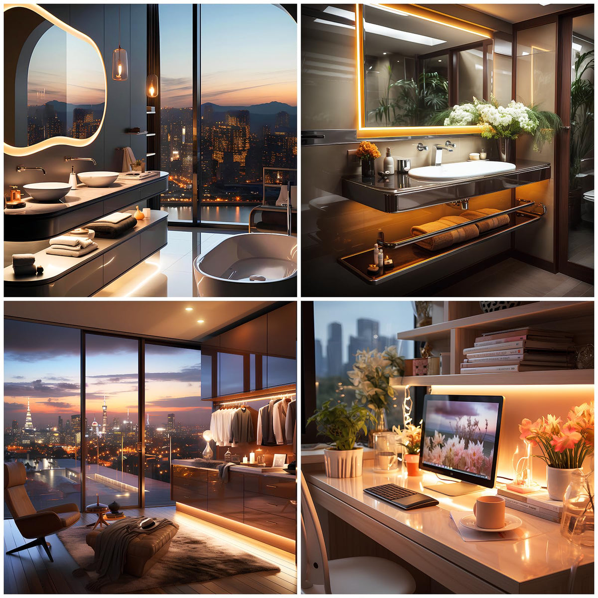 Q: What is the color temperature of the LED strip lights?A: The LED strip lights have a warm color temperature of three thousand Kelvin, creating a cozy and inviting atmosphere.
