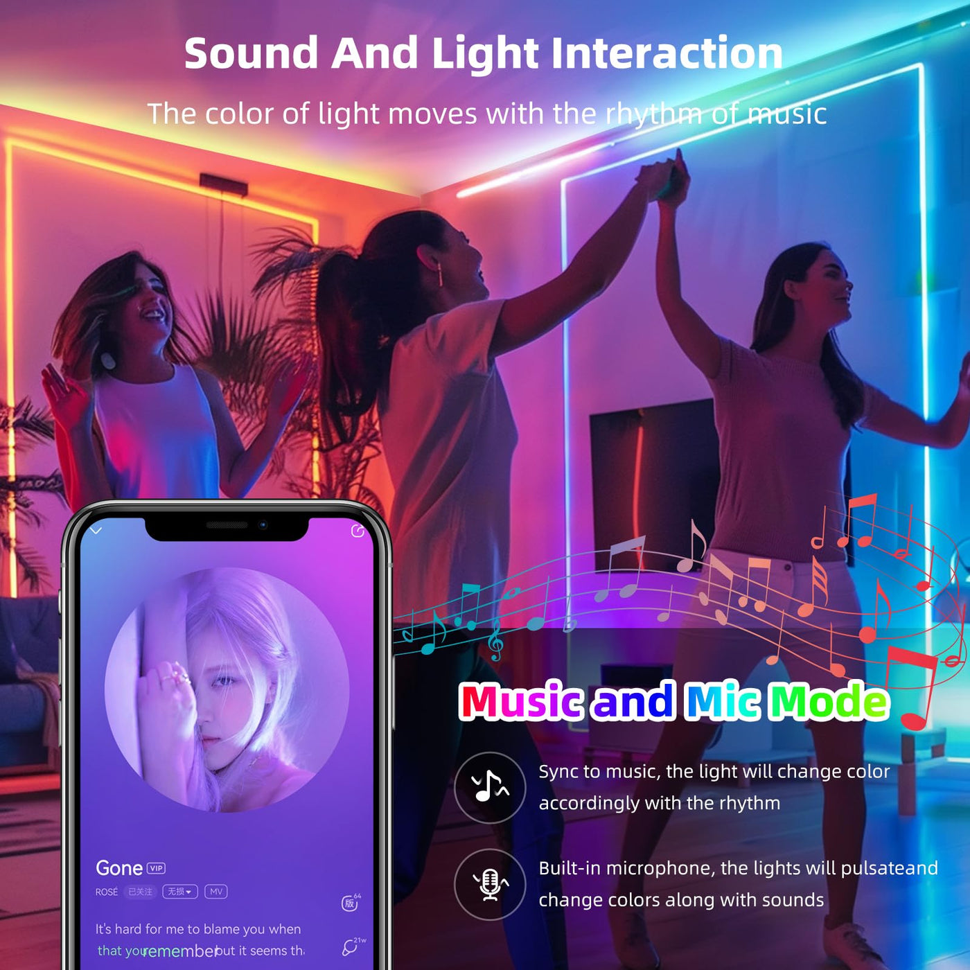Q: Can I sync the LED lights with music?A: Yes, these LED strip lights feature a built-in highly sensitive microphone that enables them to sync with ambient sounds and music, creating a vibrant and dynamic atmosphere that enhances parties and gatherings.
