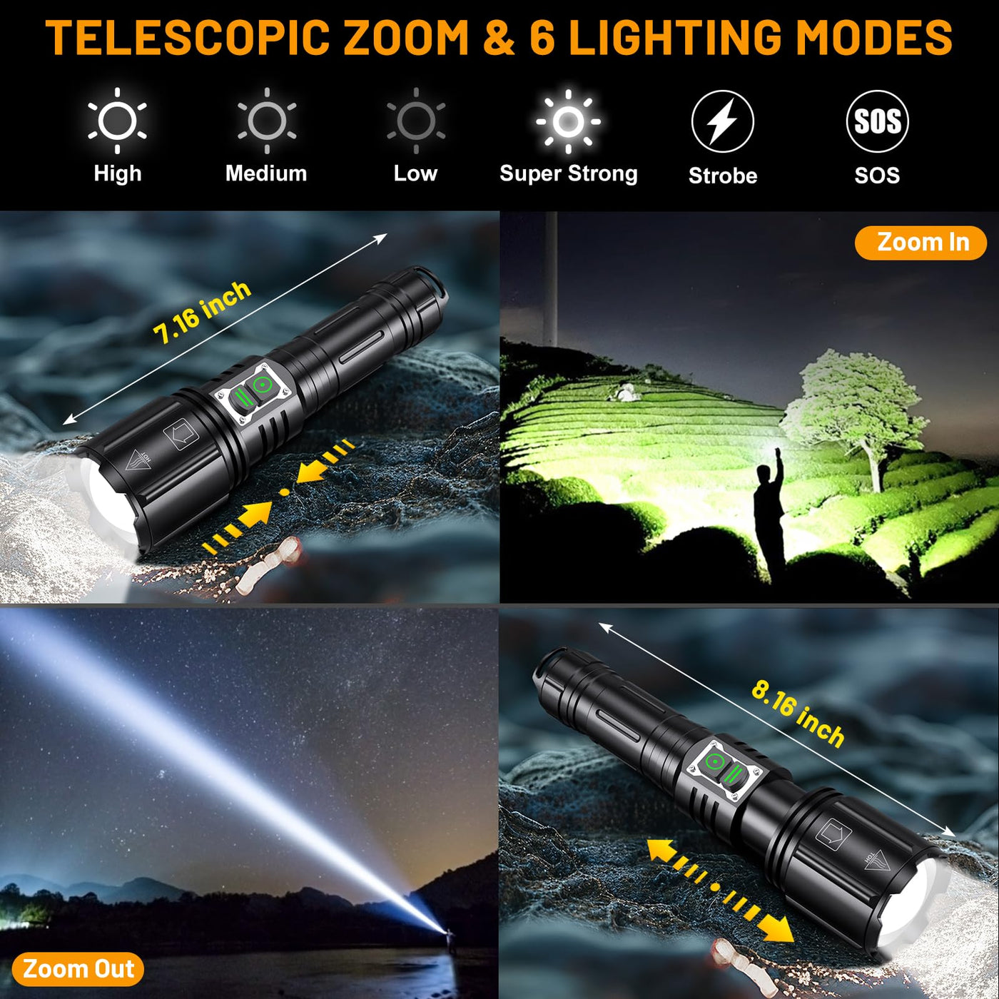 Led Super Bright Flashlight 1200000 High Lumens, High Powered Rechargeable Flashlights, 6 Modes Zoomable, Waterproof Flash Light