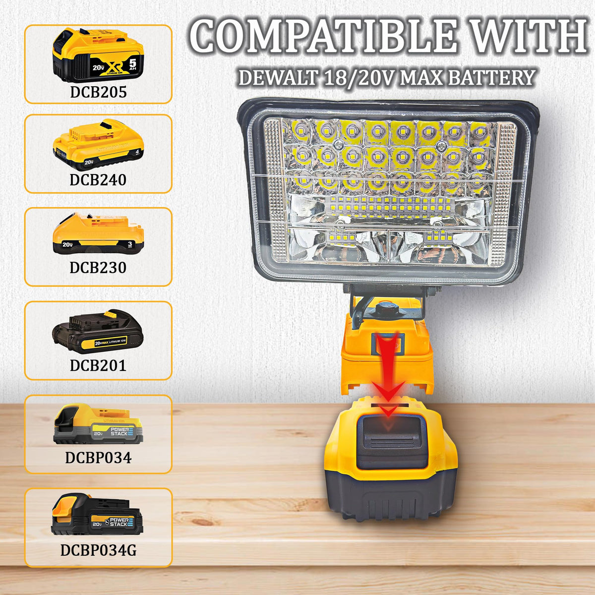 Q: Is this LED work light compatible with Dewalt 20V batteries?A: Yes, this LED work light is specifically designed to be compatible with Dewalt 20V batteries, including models such as DCB200, DCB201, DCB203, DCB204, DCB205, and DCB206.