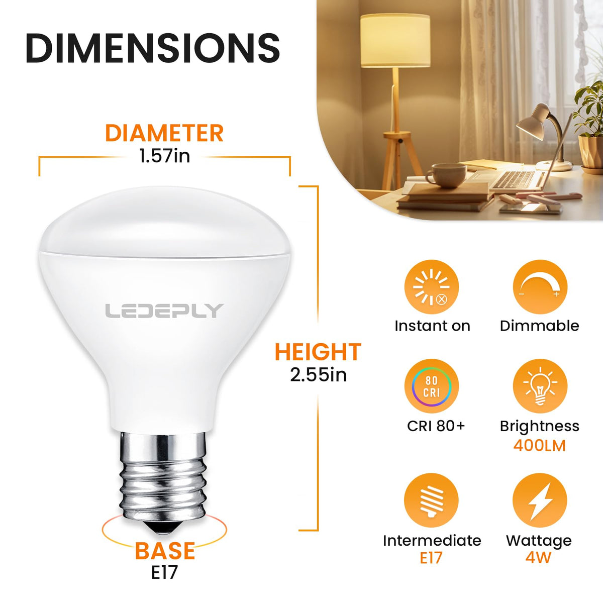 Ledeply R14 Led Bulb, 4W=40W, Dimmable, E17 Base, Mini Led Reflector Floodlight Bulb, 400 Lumens, 2700K Warm White, 4 Pack