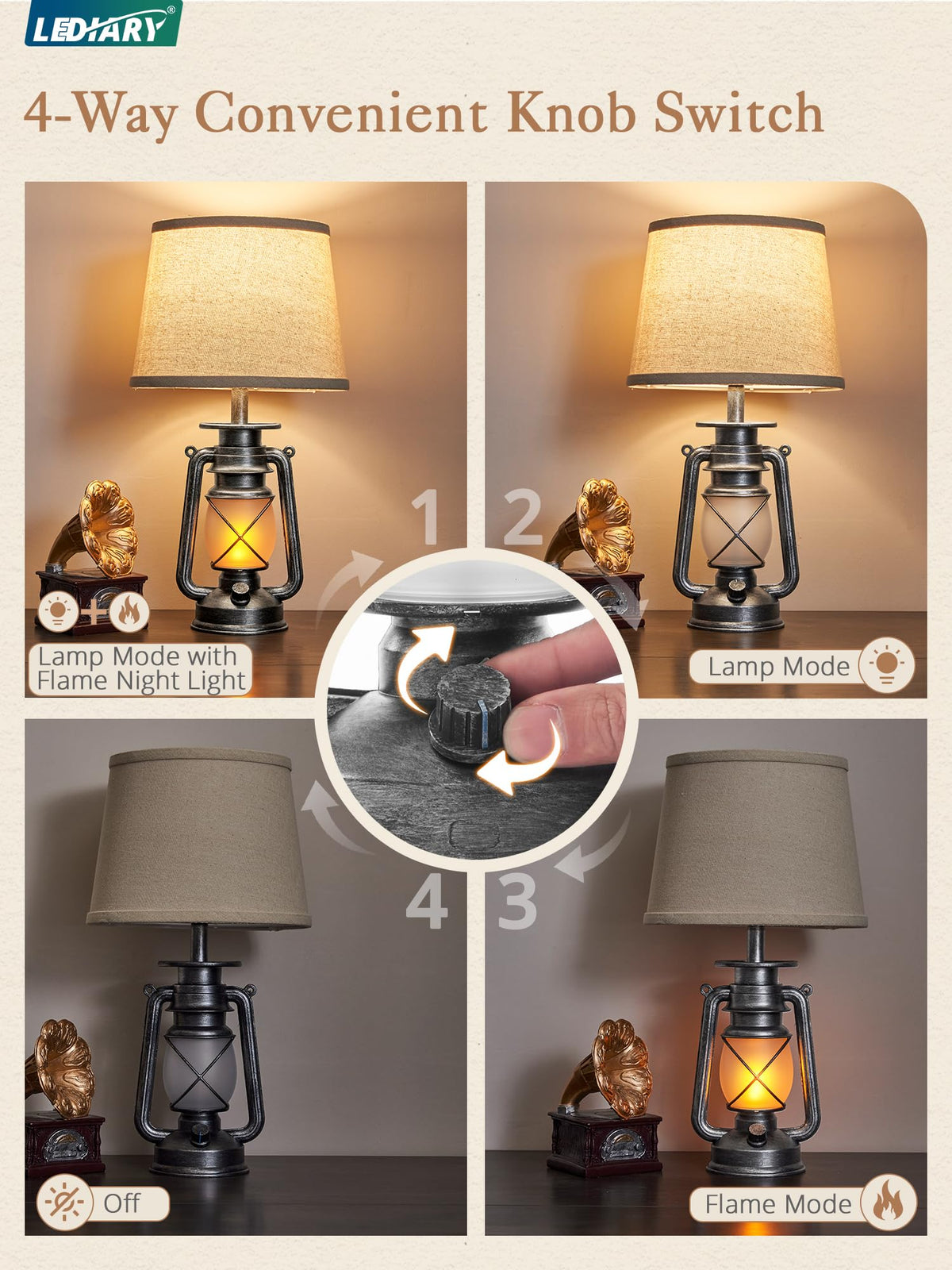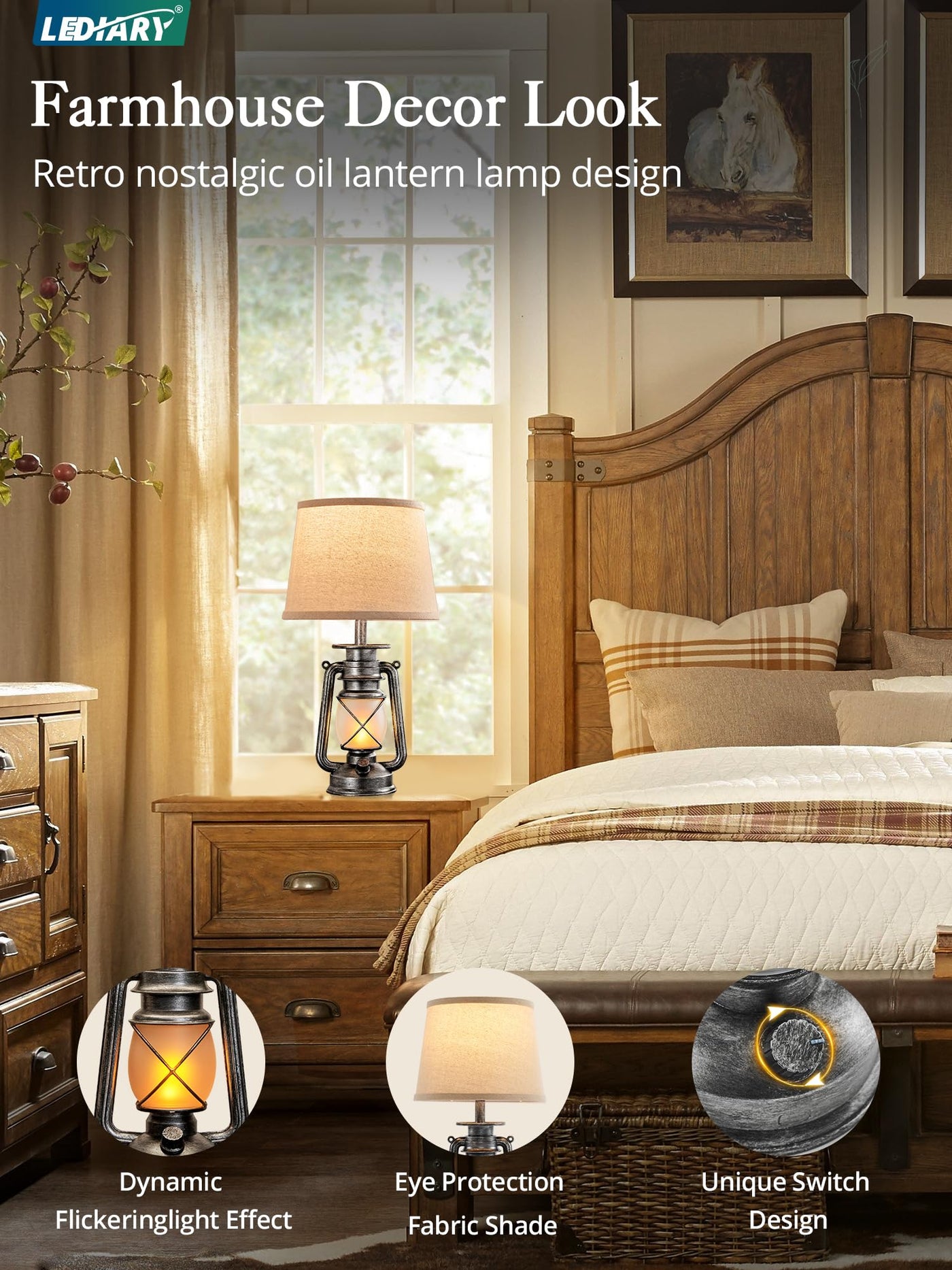 Lediary 18.72'' Sliver Led Lantern Flickering Flame Table Lamps For Bedrooms Set Of 2, Small Farmhouse Rustic End Table Lamps, H