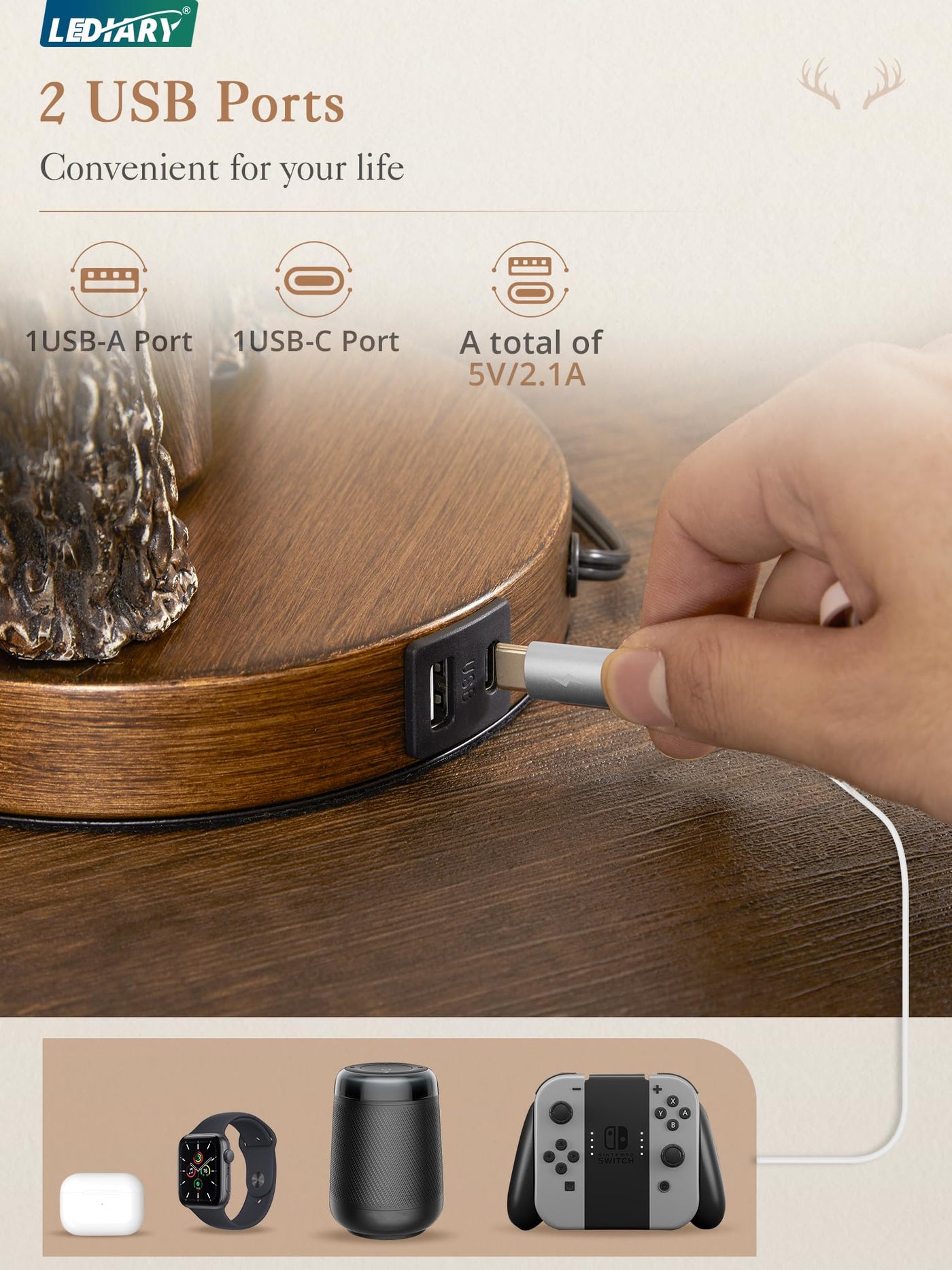 LEDIARY 23.8 Antler Table Lamps Set of 2 with Nightlight, 2 USB Ports Rustic Western Lamp with Deer Linen Fabric Shade, Cabin De