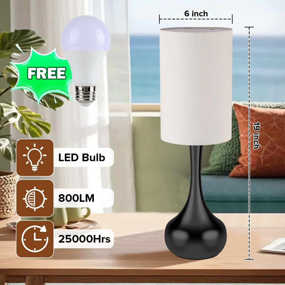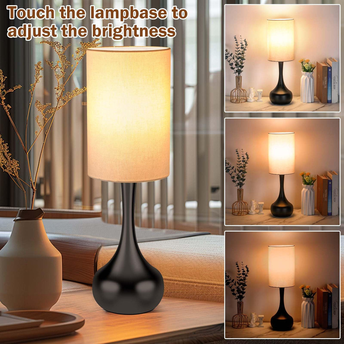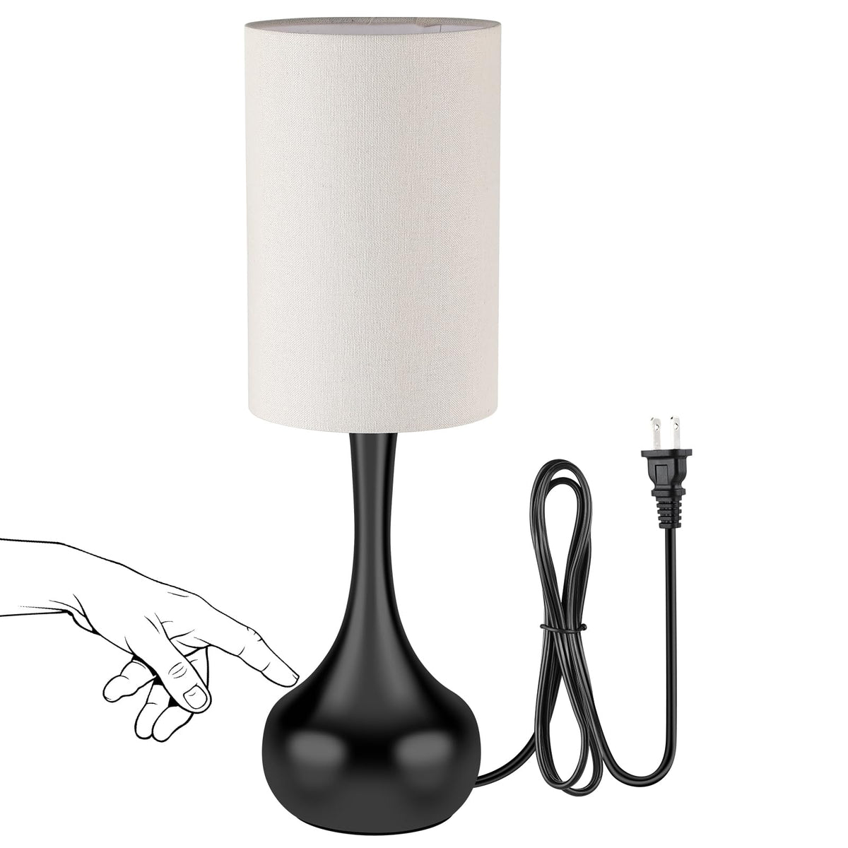 LEDIKON Touch Control Bedside Lamp,3-Way Dimmable,Modern Black Table Lamp, Space Saving Small Nightstand Lamp for Bedroom, Livin