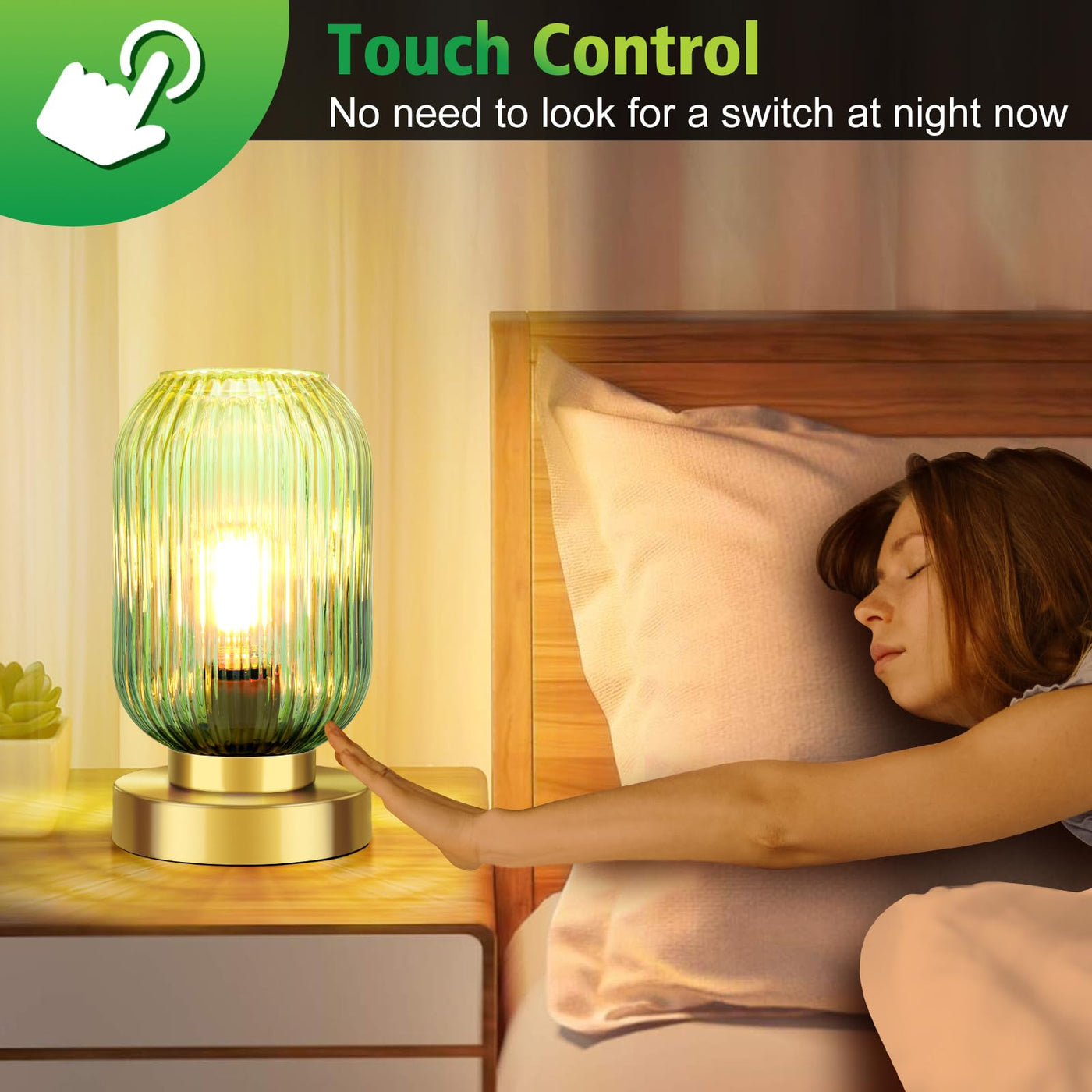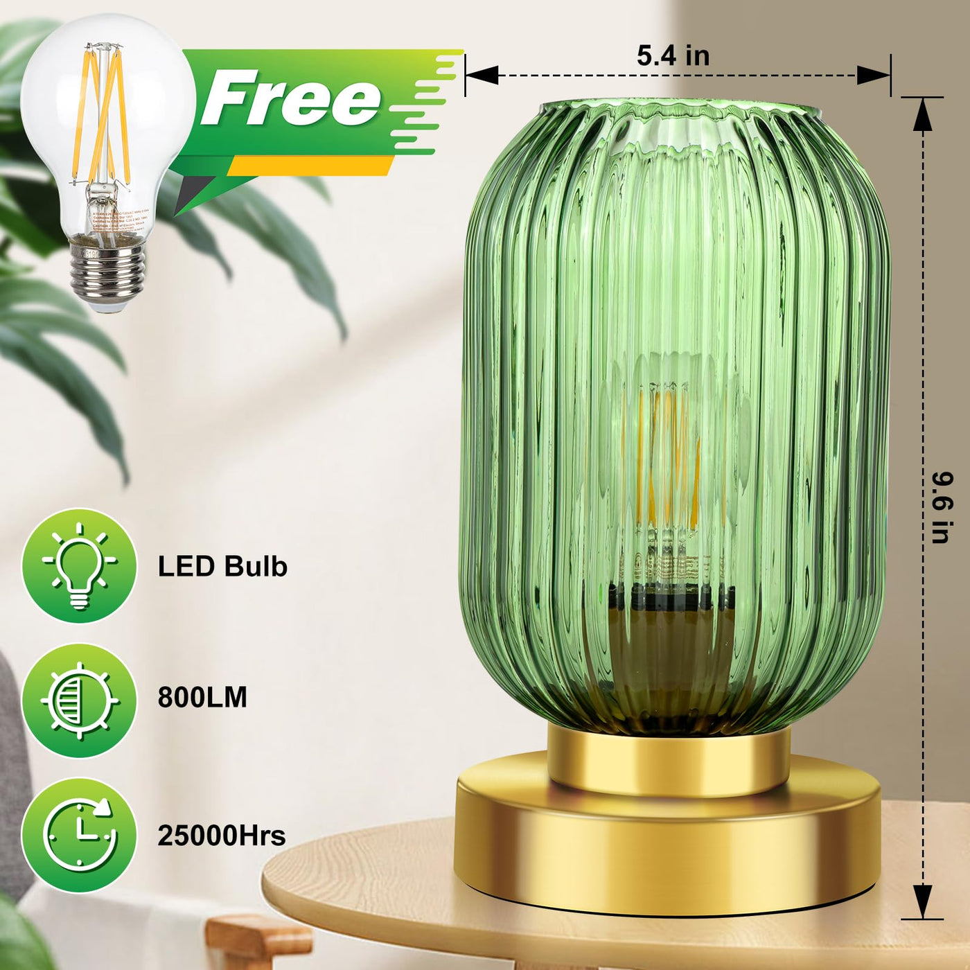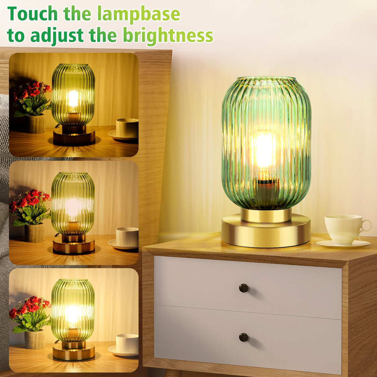 Ledikon Touch Control Mid Century Modern Table Lamp, 3 Way Dimmable, Green Glass, Small Gold, Vintage Bedside Lamp For Bedroom,